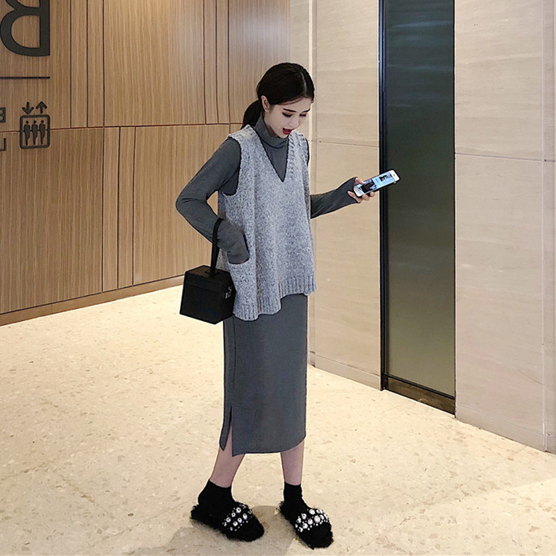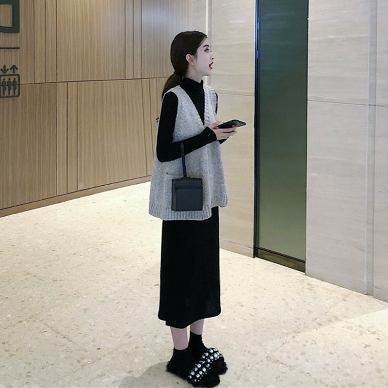 早秋毛衣配裙子法式初戀氣質長裙復古馬甲過膝針織兩件套裝秋冬