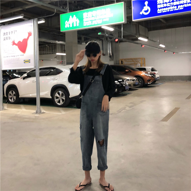 2018新款女夏學院風百搭復古chic風口袋破洞小清新學生牛仔背帶褲
