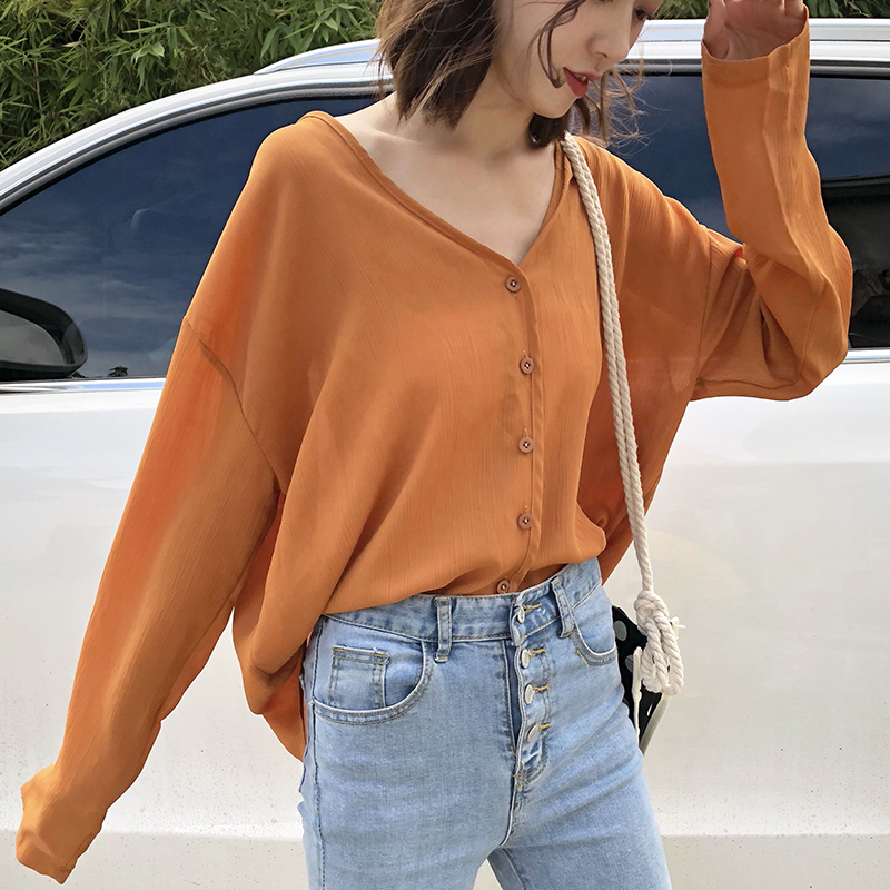 / 港風氣質polo衫早秋新款女裝時尚休閑寬松黑色襯衫V領長袖上衣潮