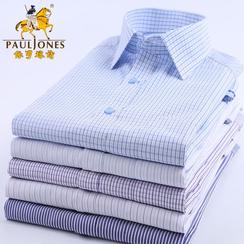 夏季小藍格子短袖襯衫男士商務休閑工裝半袖襯衣白底藍條免燙寸衫