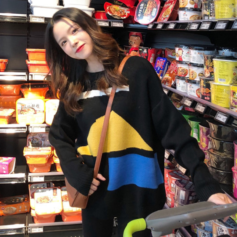 秋裝女2018新款韓版學生拼色寬松長袖毛衣時尚慵懶風清新圓領上衣