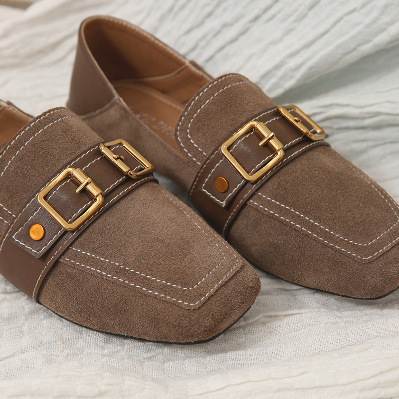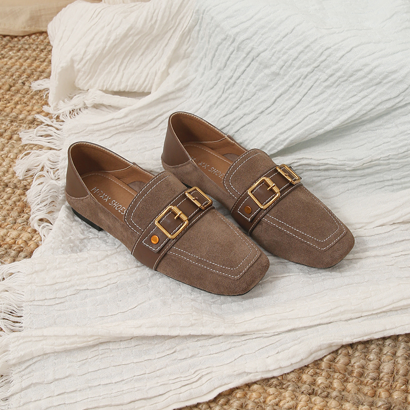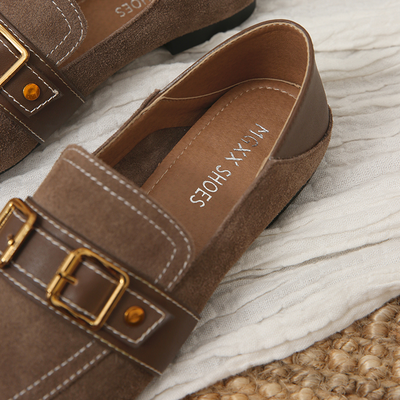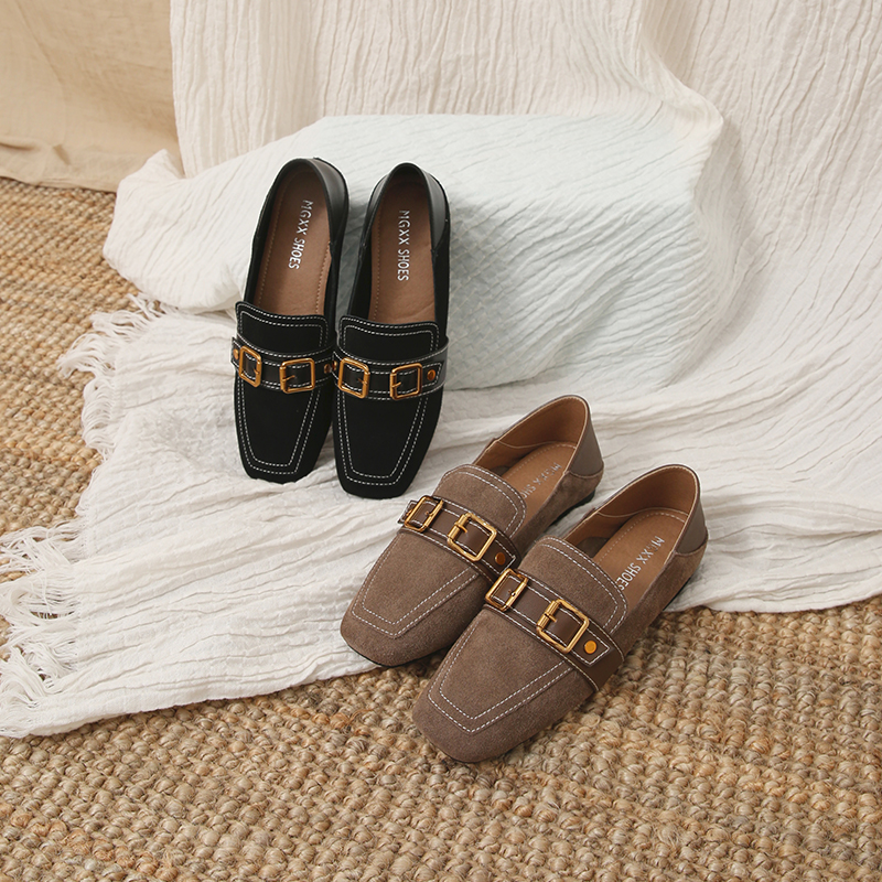 MG小象方頭帶扣單鞋女秋2018新款休閑時尚平底鞋一腳蹬復古鞋子潮