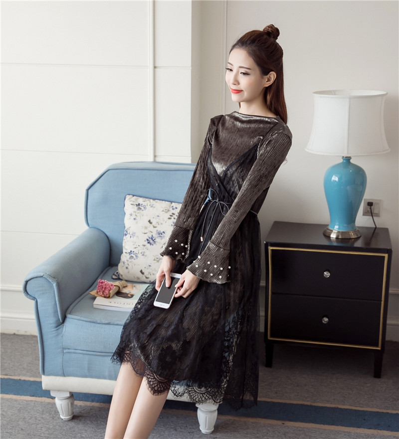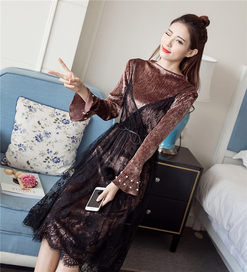 / 早春新款女裝蕾絲中長吊帶裙氣質釘珠喇叭袖絲絨連衣裙兩件套