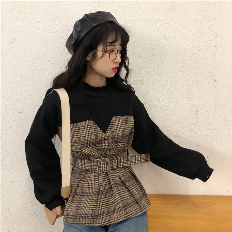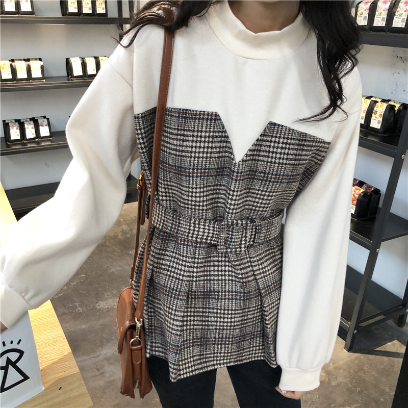 秋裝女2018新款韓版毛呢格子拼接加絨假兩件衛衣收腰綁帶上衣外套