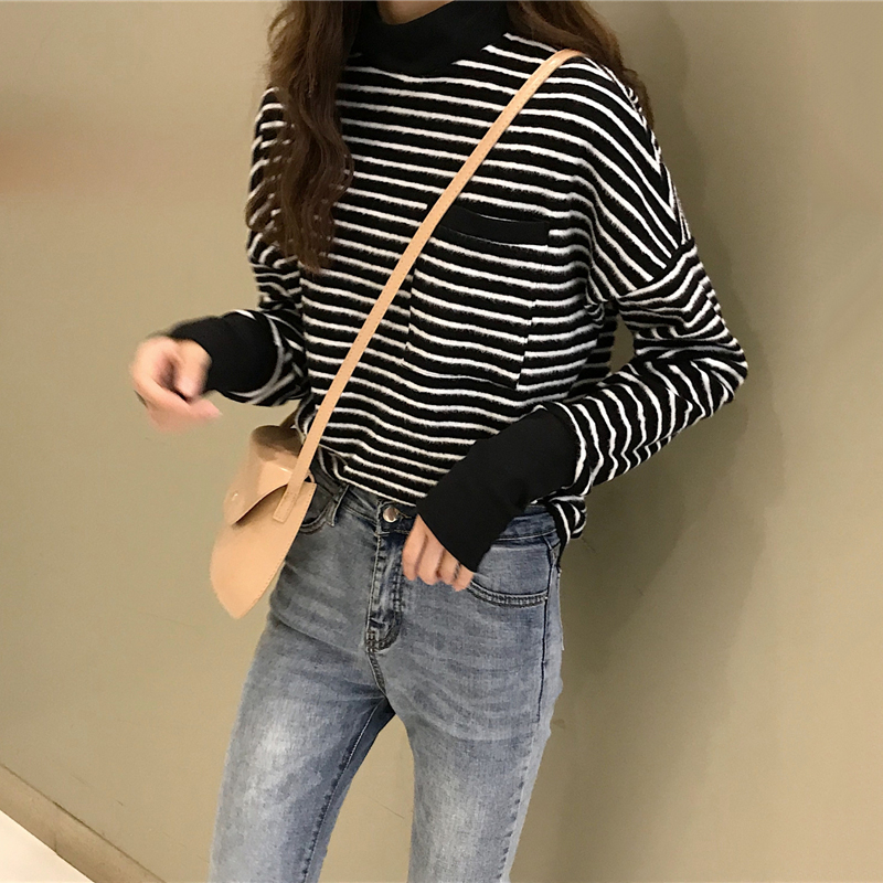 / 時尚條紋拼接螺紋打底衫衛衣秋冬女裝2018新款學生休閑長袖上衣潮