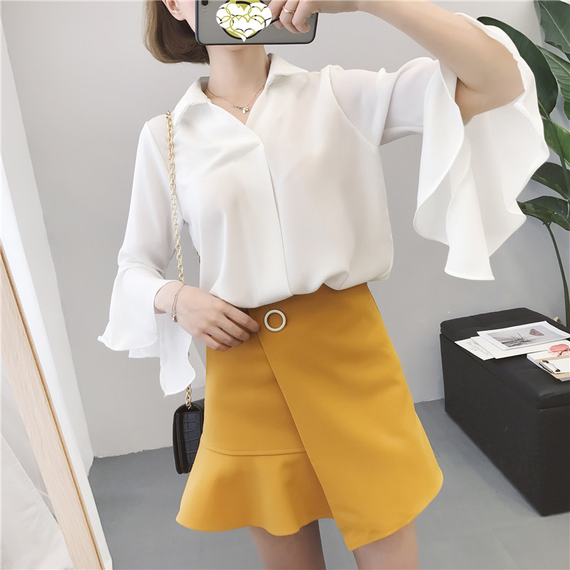 / 秋裝女2018新款韓版簡約喇叭袖雪紡襯衫學生時尚洋氣寬松V領上衣