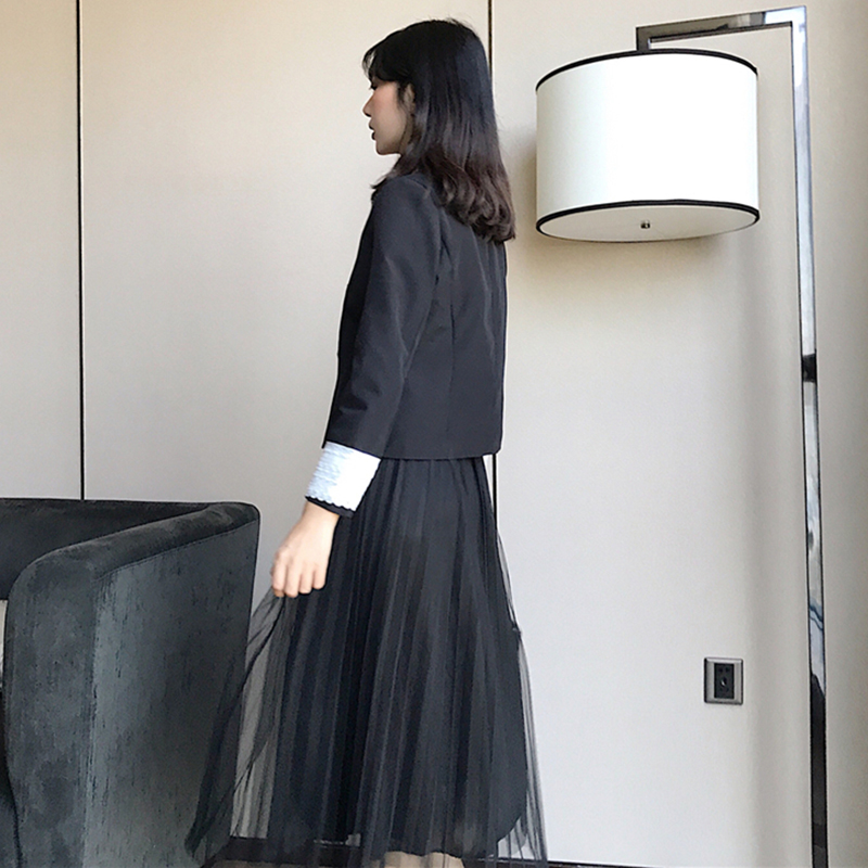 / 氣質女神兩件套冬裝新款蝴蝶結修身短款外套中長款高腰網紗半身裙
