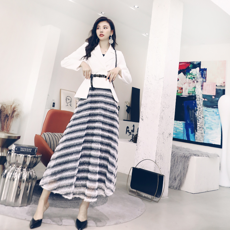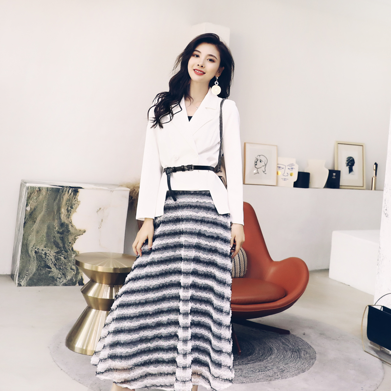 / 名媛氣質2018秋裝新款女修身長袖西裝外套網紗長款半身裙氣質套裝