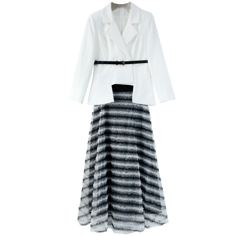 名媛氣質2018秋裝新款女修身長袖西裝外套網紗長款半身裙氣質套裝