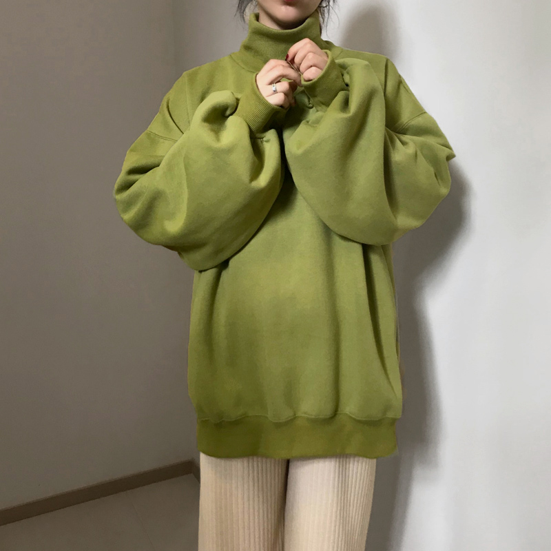 / 復古韓國chic牛油果綠高領燈籠袖加厚加絨保暖套頭衛衣女2018新款