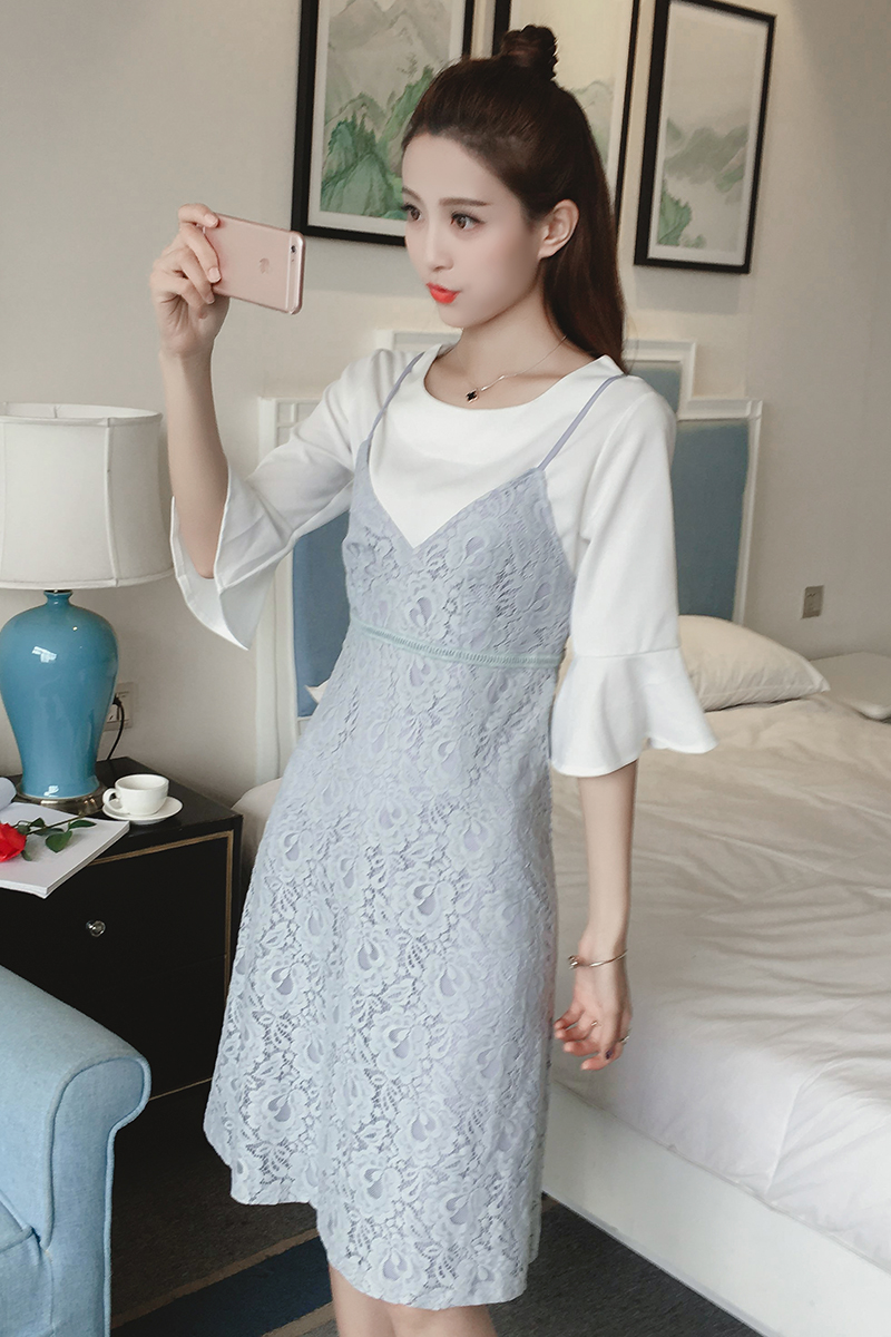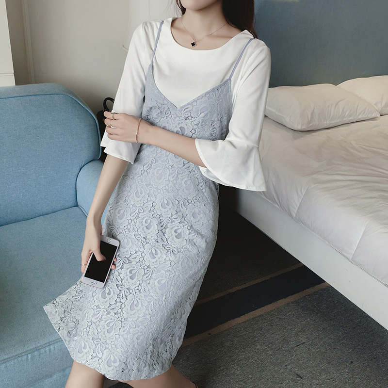 / 夏季新款女裝韓版小清新V領無袖吊帶裙中長款修身蕾絲連衣裙