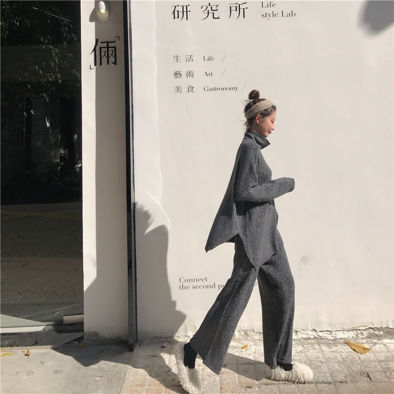 復古慵懶寬松加厚保暖高領毛衣女秋冬新款+高腰顯瘦針織闊腿褲潮