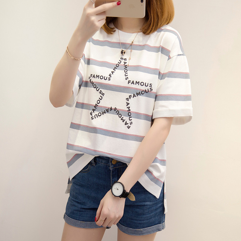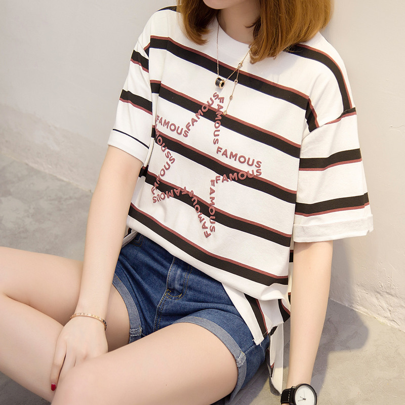 / 條紋t恤女短袖韓版潮夏裝新款女裝開叉時尚體恤百搭上衣女夏