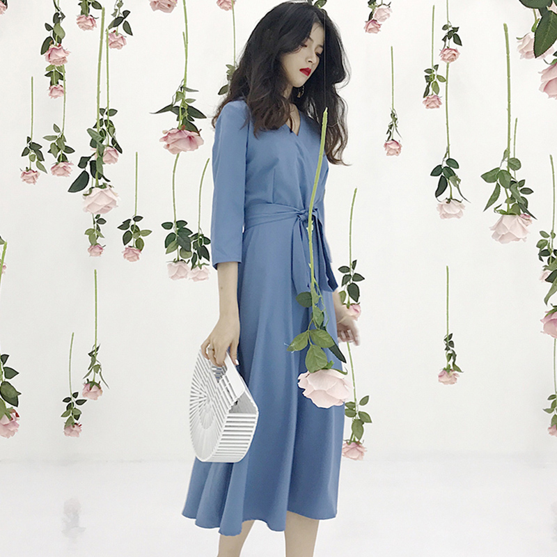 / 早秋復古女裝2018新款氣質收腰中長款連衣裙中袖V領A字裙大擺裙子