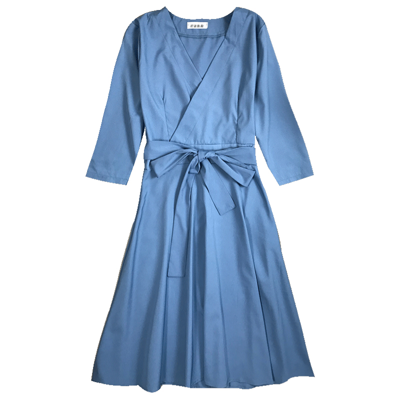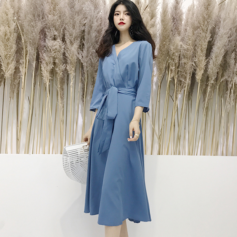 早秋復古女裝2018新款氣質收腰中長款連衣裙中袖V領A字裙大擺裙子
