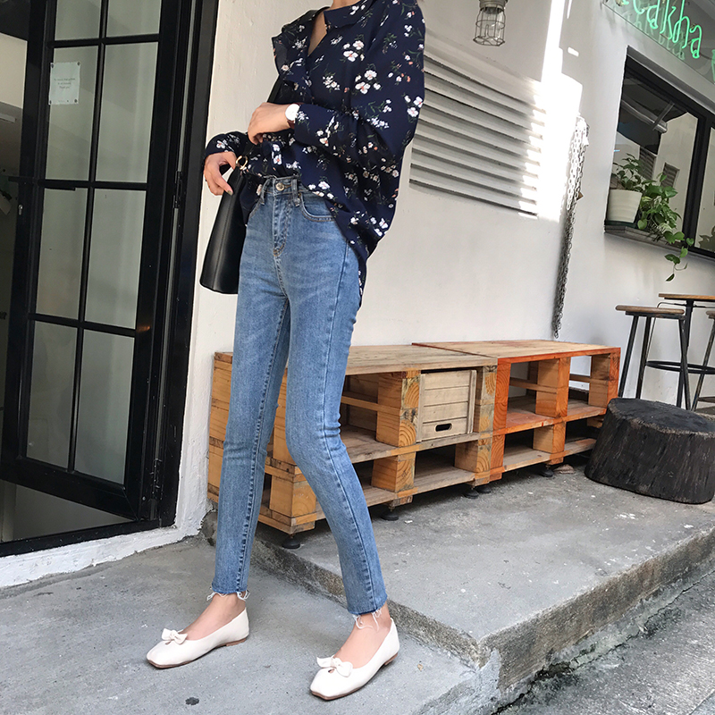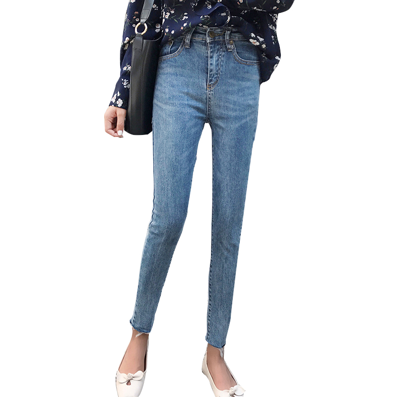 / 春裝女裝韓版高腰百搭修身顯瘦毛邊牛仔褲鉛筆褲淺藍色小腳褲學生