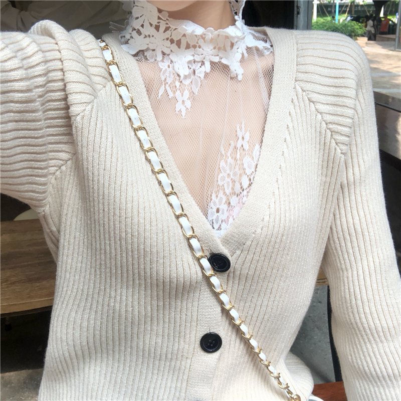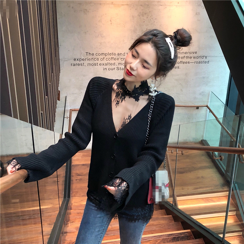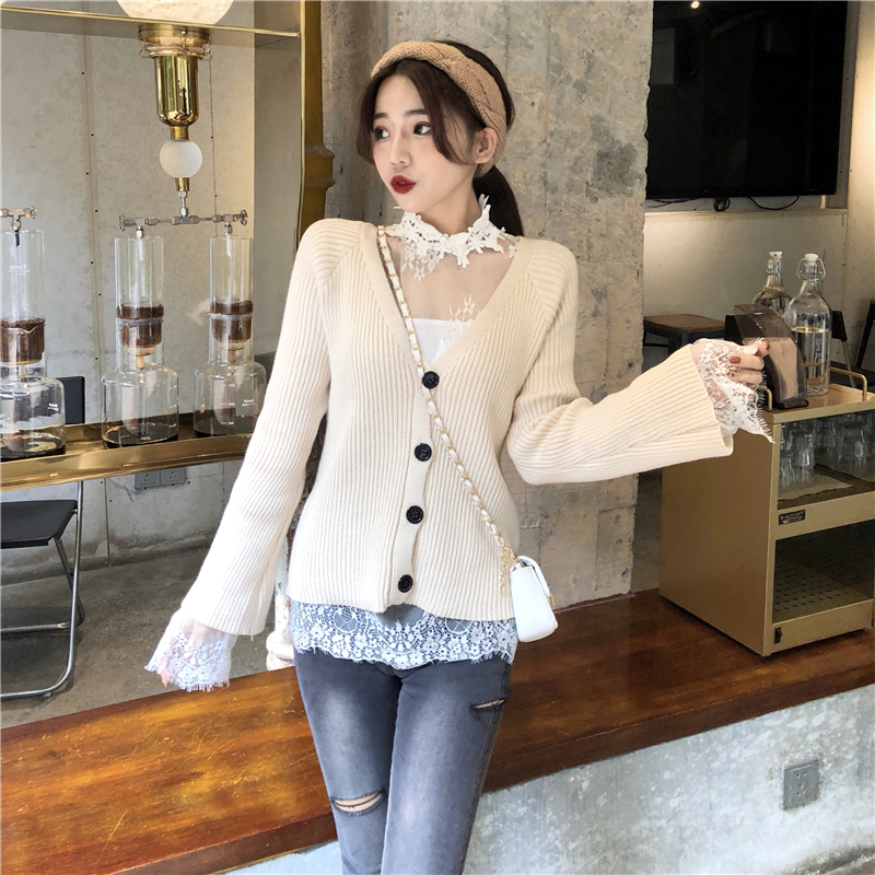 / 韓版時尚秋裝女2018新款套裝透視蕾絲打底衫+寬松開衫外套針織衫