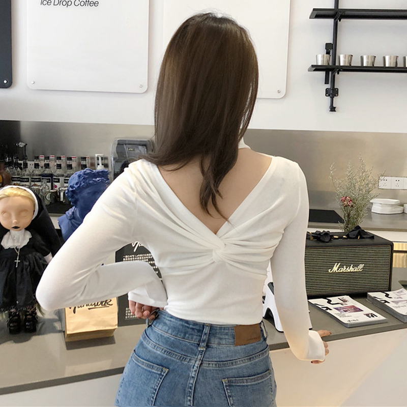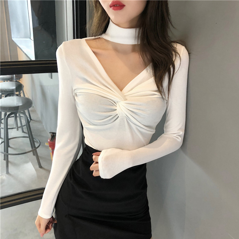 氣質chic掛脖V領T恤女秋冬裝2018新款韓版修身顯瘦扭結長袖打底衫
