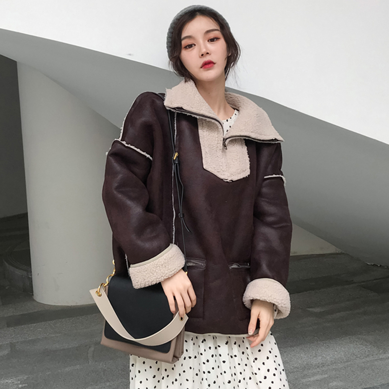 / 復古加厚拼接羊羔毛外套秋冬女裝2018新款港風大衣學生休閑上衣潮
