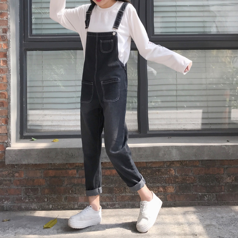 / 2018早春新款女裝學院風高腰寬松顯瘦學生哈倫褲九分背帶牛仔褲女
