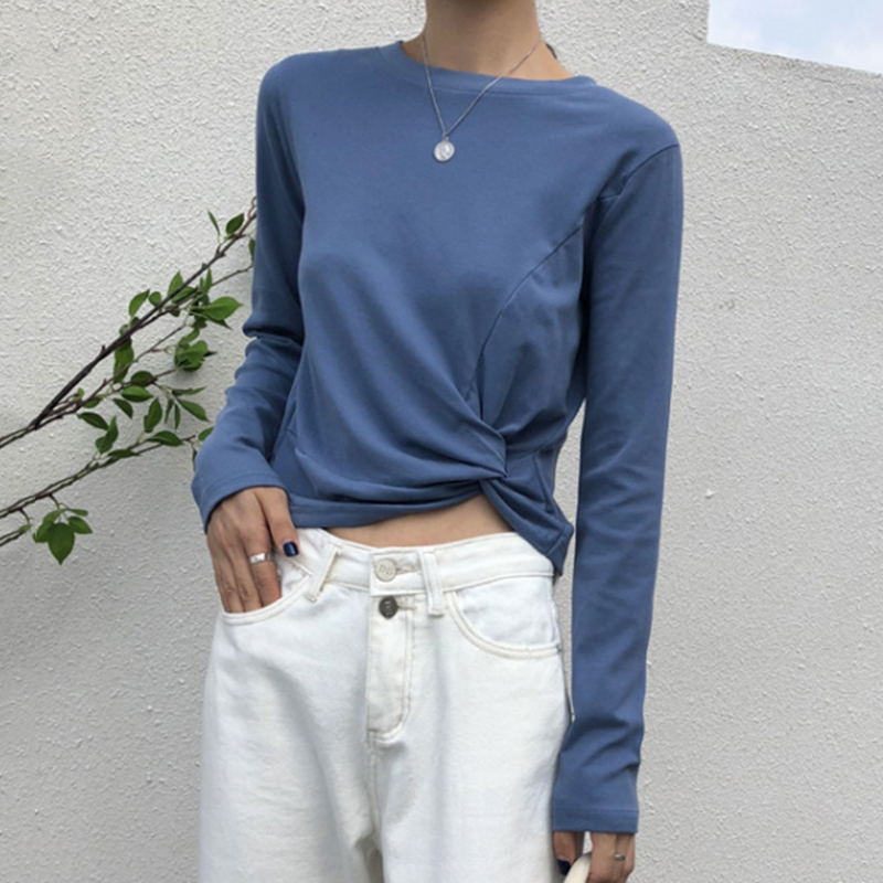 時尚短上衣秋裝女2018新款韓版修身圓領打底衫學生打結長袖黑T恤