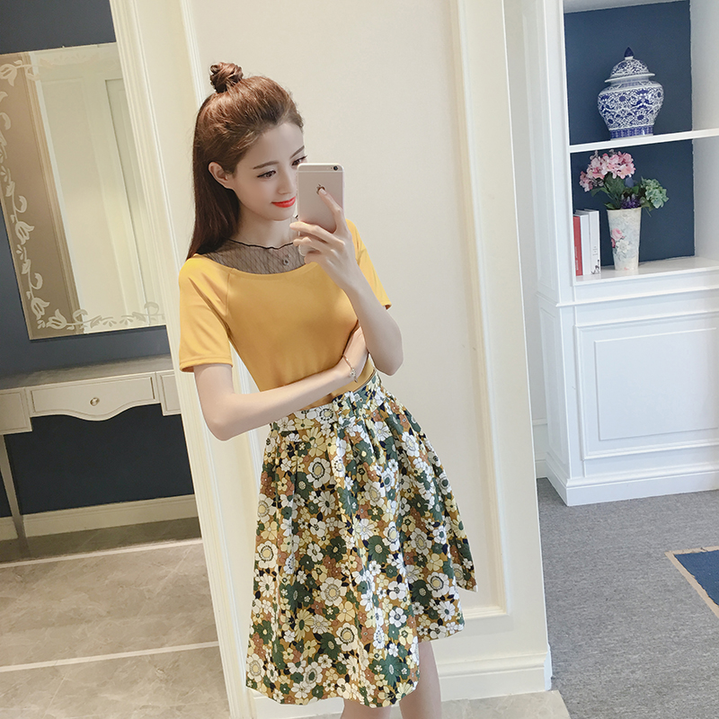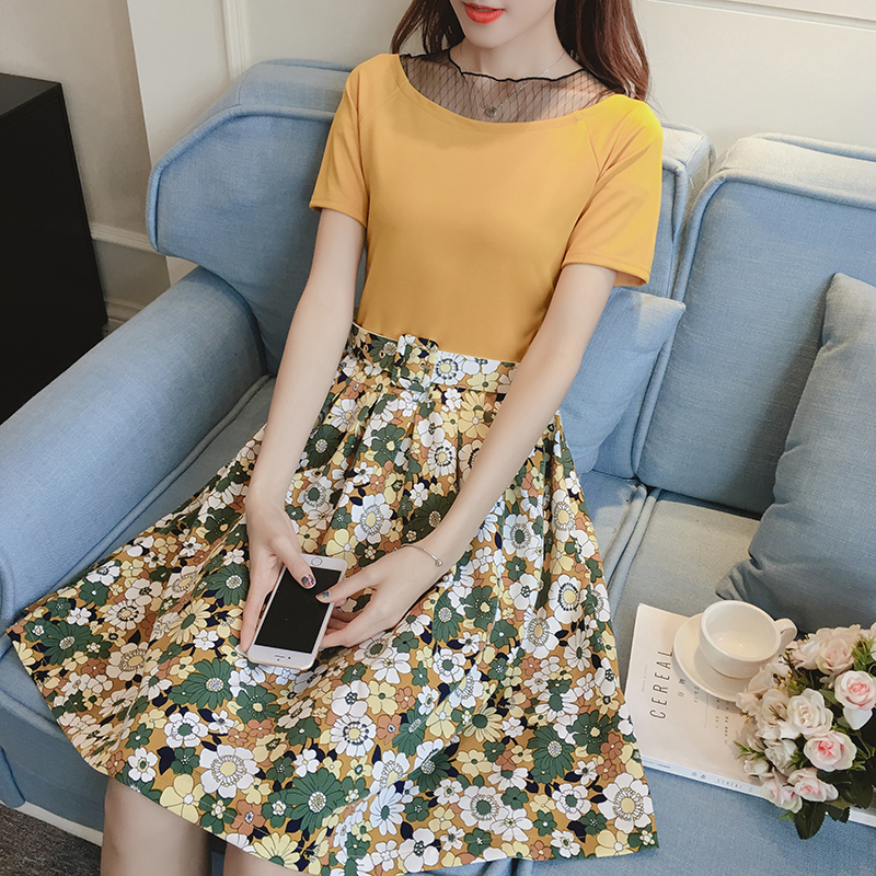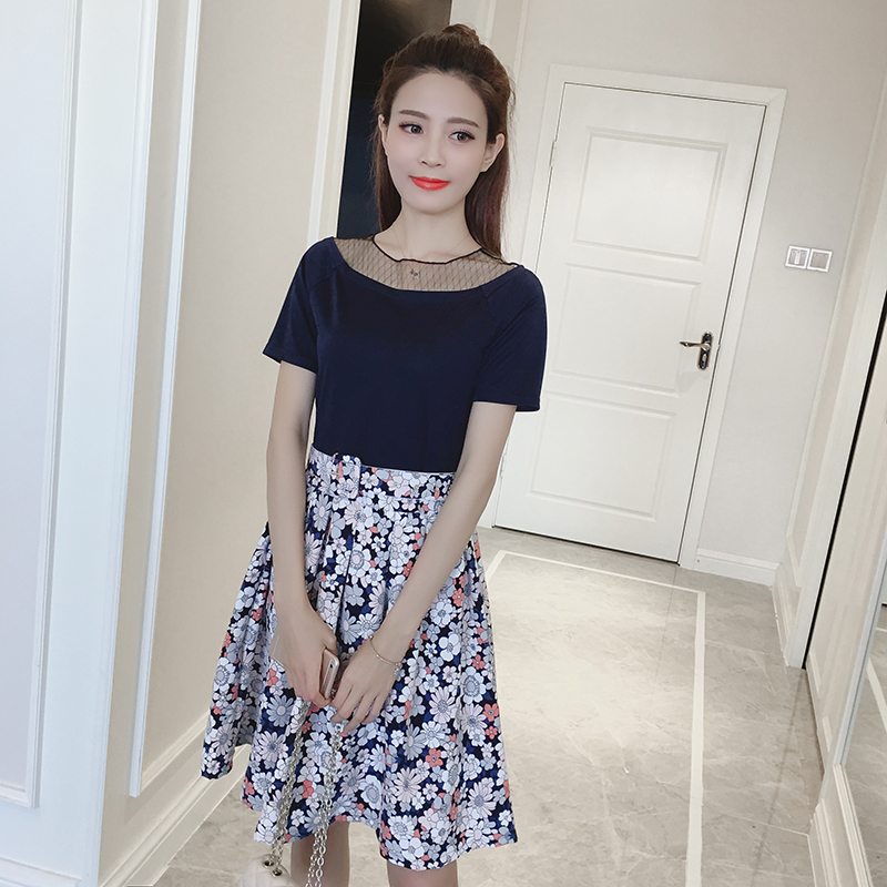 夏季新款女裝韓版網紗拼接印花中長款修身假兩件短袖連衣裙子