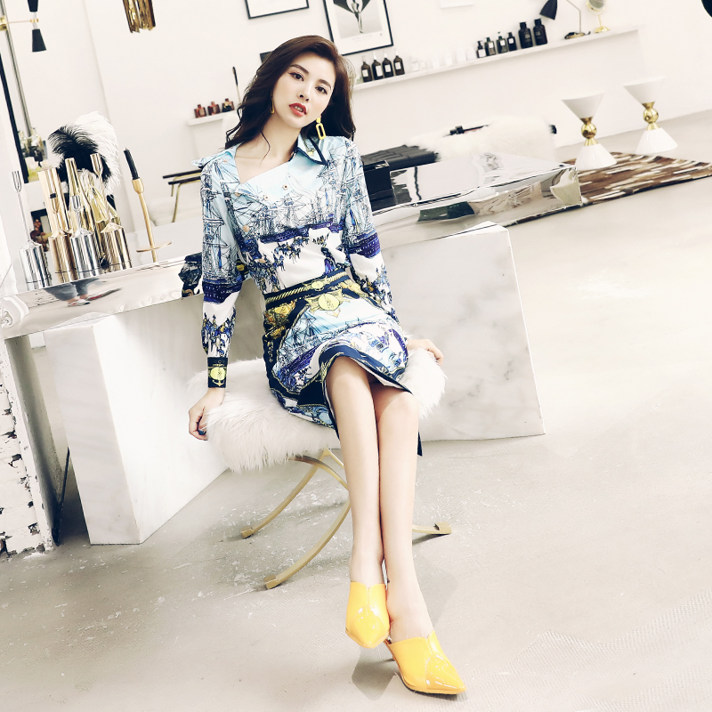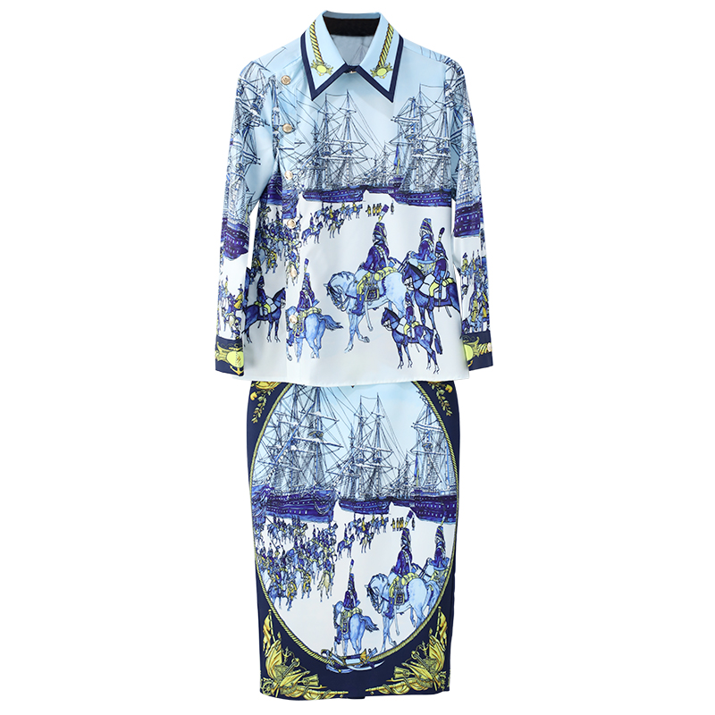 / 名媛氣質2018秋季新款歐美女裝印花襯衫上衣高腰半身裙兩件套裝潮