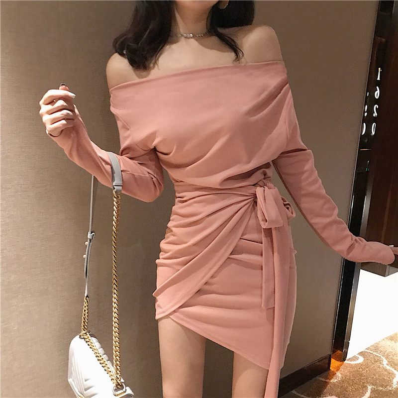 小心機新款韓版秋季女裝短裙百搭修身顯瘦不規則綁帶露肩連衣裙潮