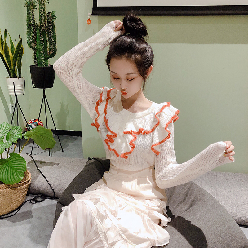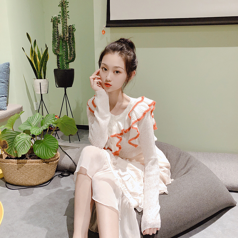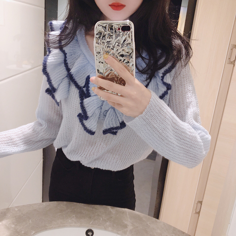 2018秋裝新款韓版上衣女甜美長袖V領荷葉邊復古chic拼色針織毛衣