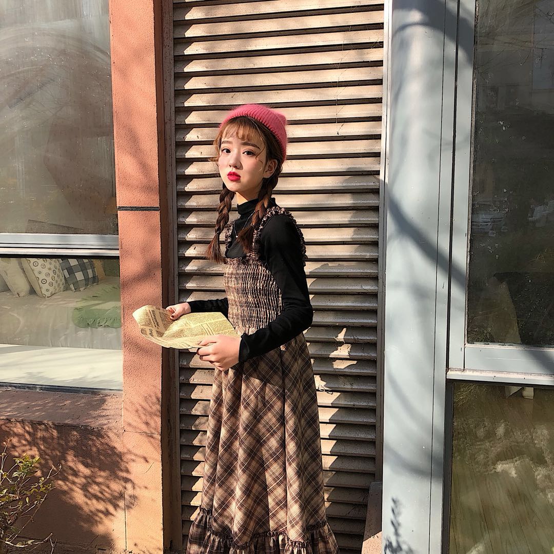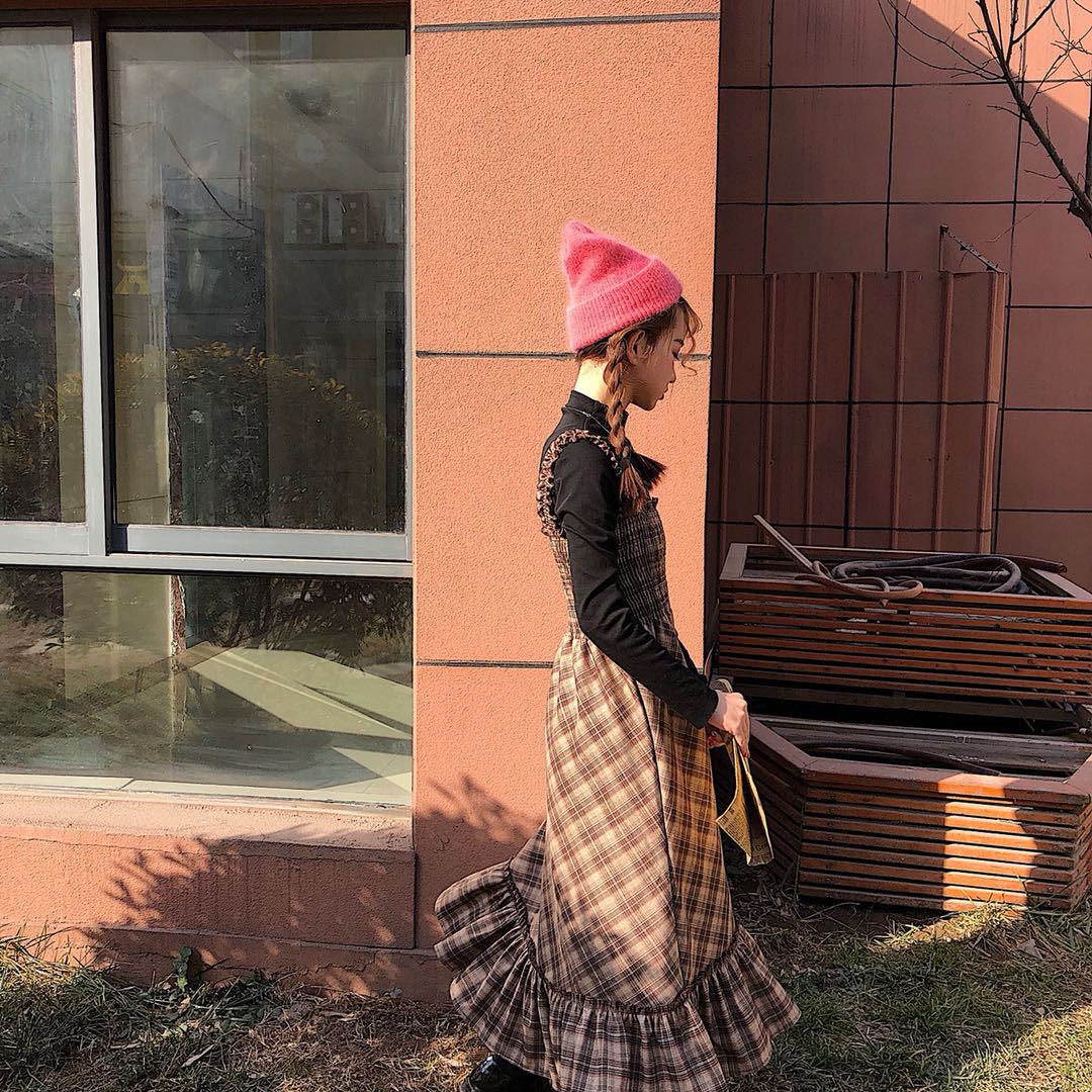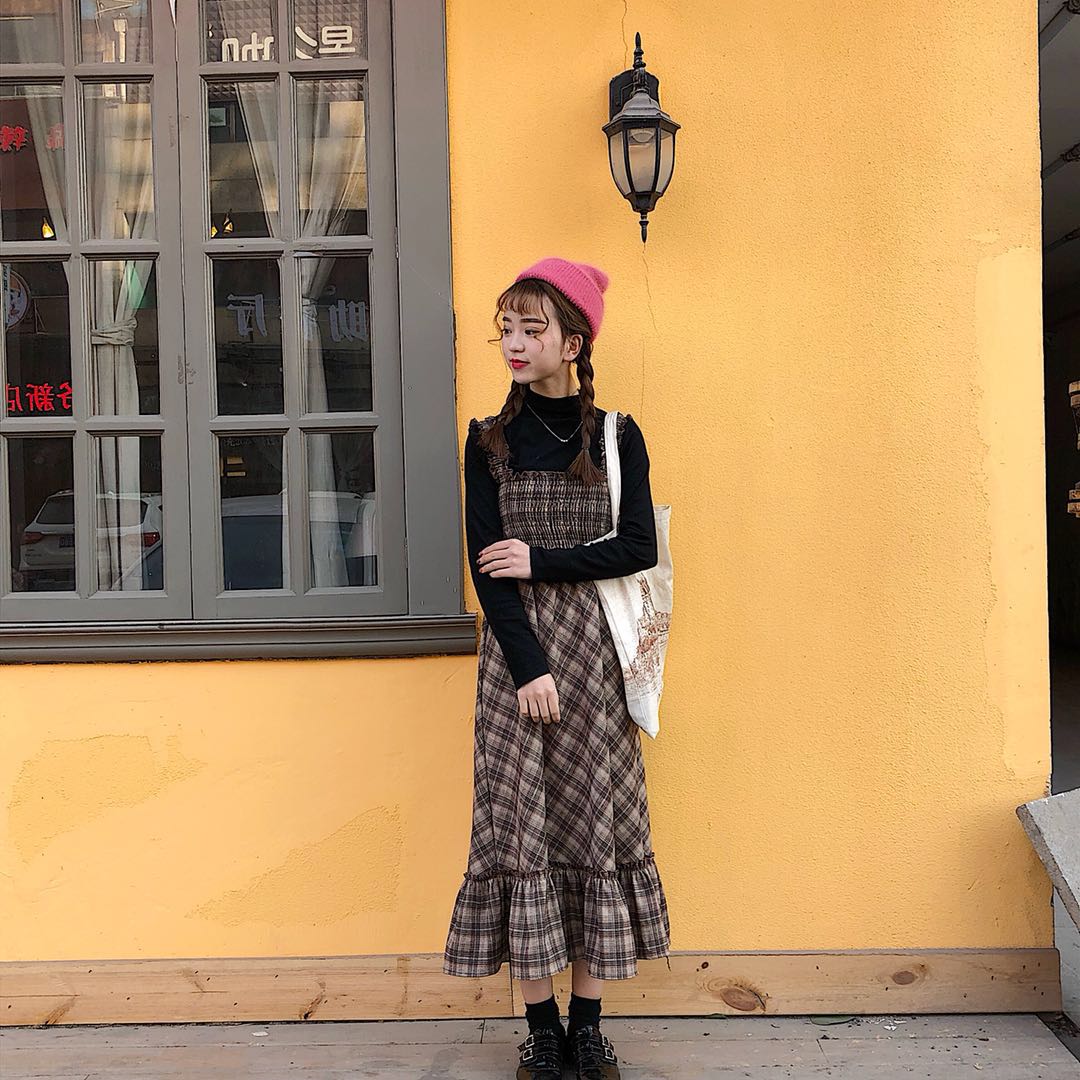 / 秋季女裝韓版氣質收腰顯瘦格子背帶裙學生中長款荷葉邊連衣裙長裙