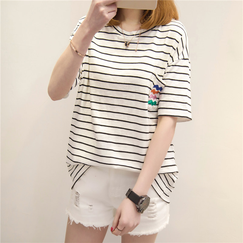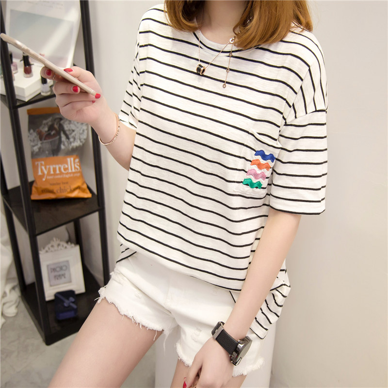 衣服女春裝新款潮條紋短袖t恤女寬松上衣韓版學生百搭打底衫