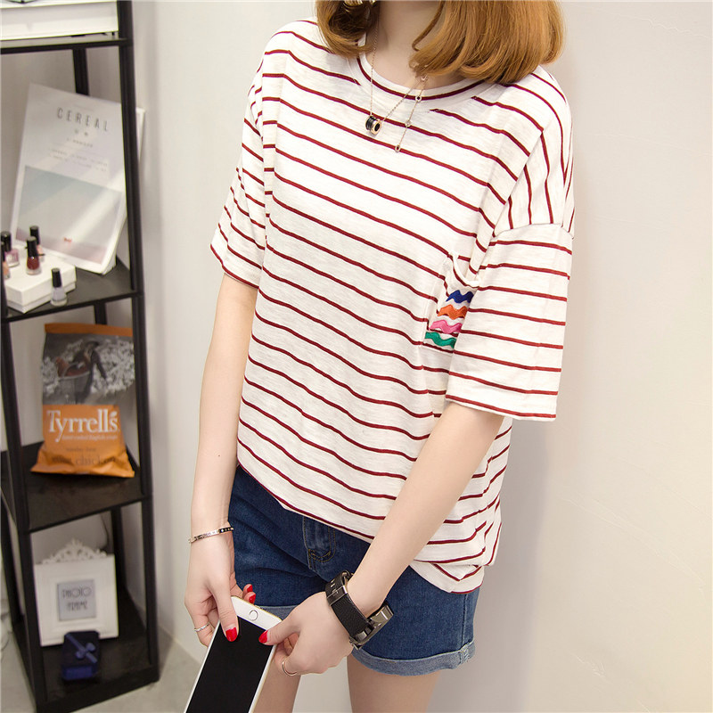 / 衣服女春裝新款潮條紋短袖t恤女寬松上衣韓版學生百搭打底衫