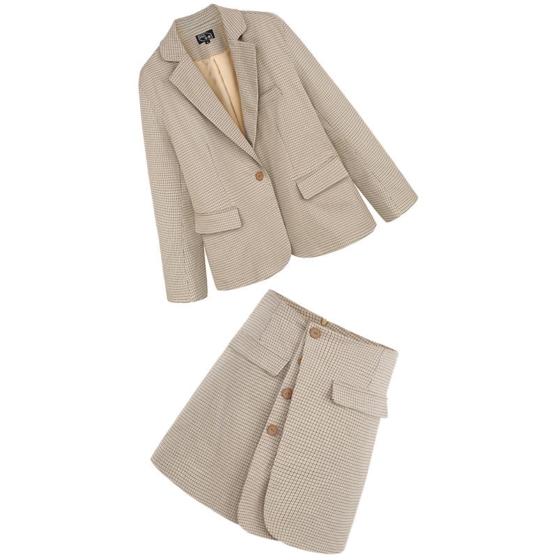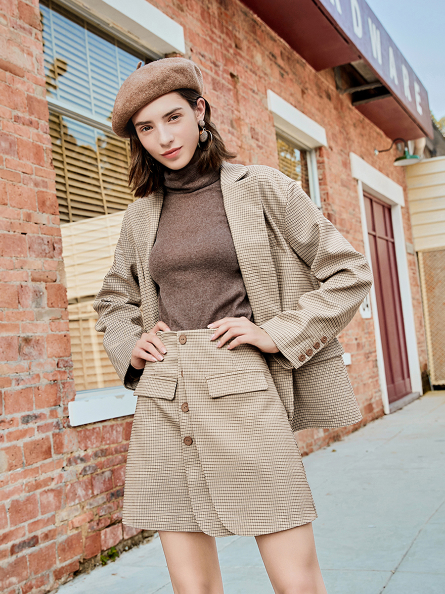 / MG小象西裝格子外套女2018新款高腰短裙休閑港味復古chic西服上衣