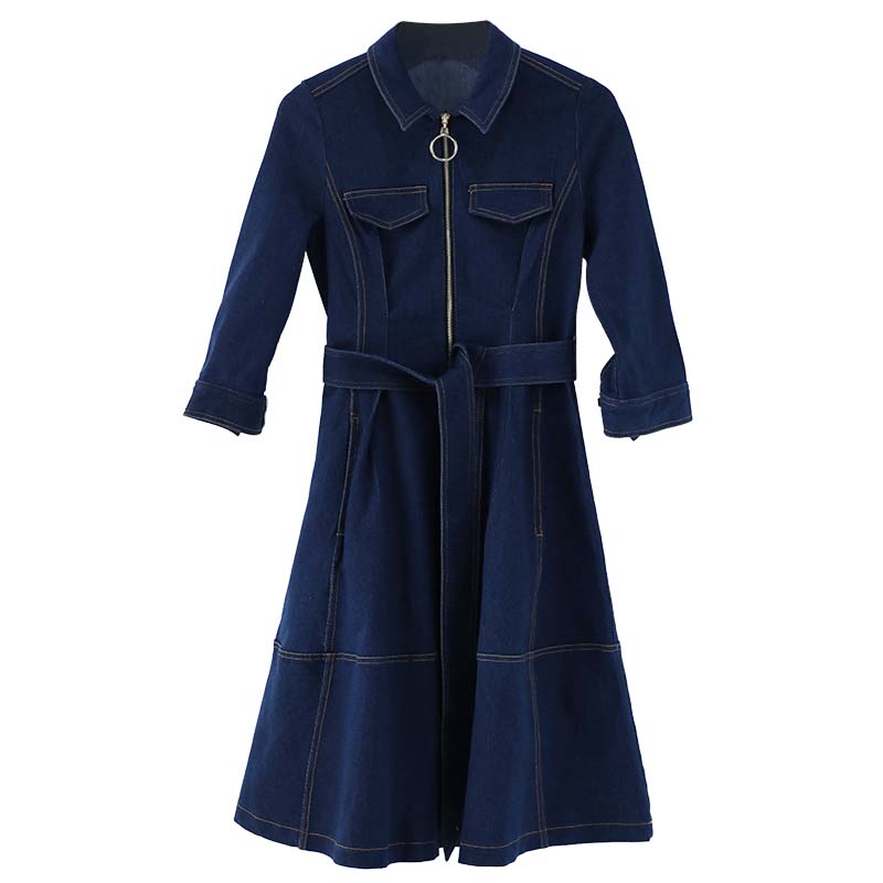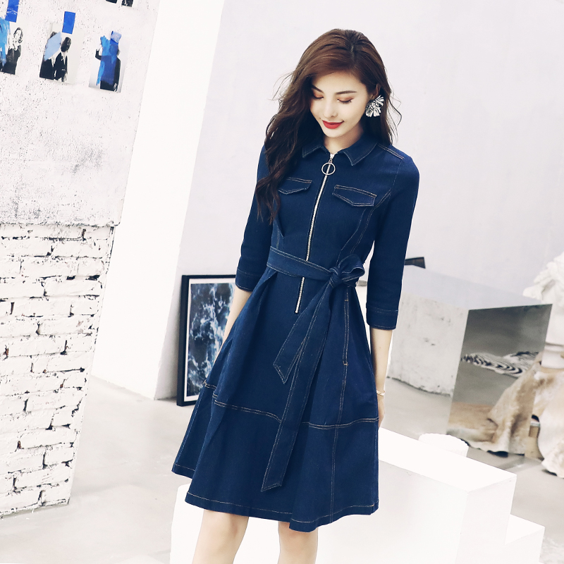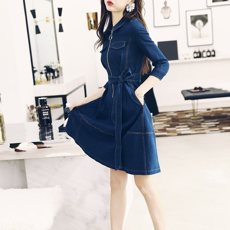 牛仔連衣裙女2018秋裝新款氣質修身收腰高腰a字裙中長款襯衫裙子