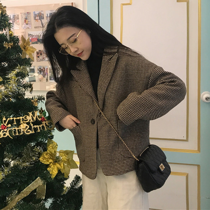 2018流行毛呢外套女秋冬裝新款復古風格子小西裝學生寬松呢子開衫