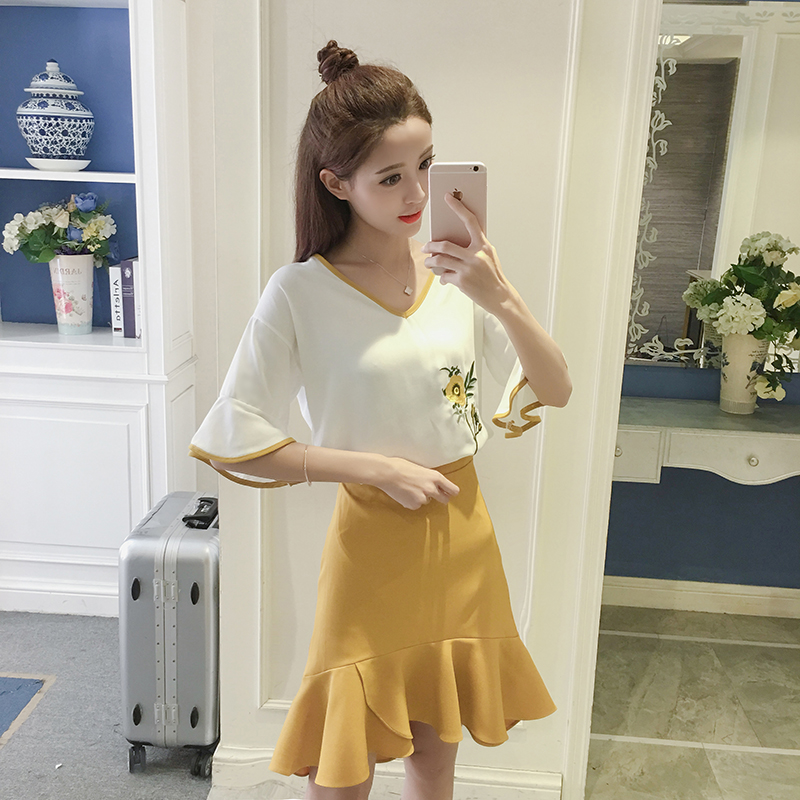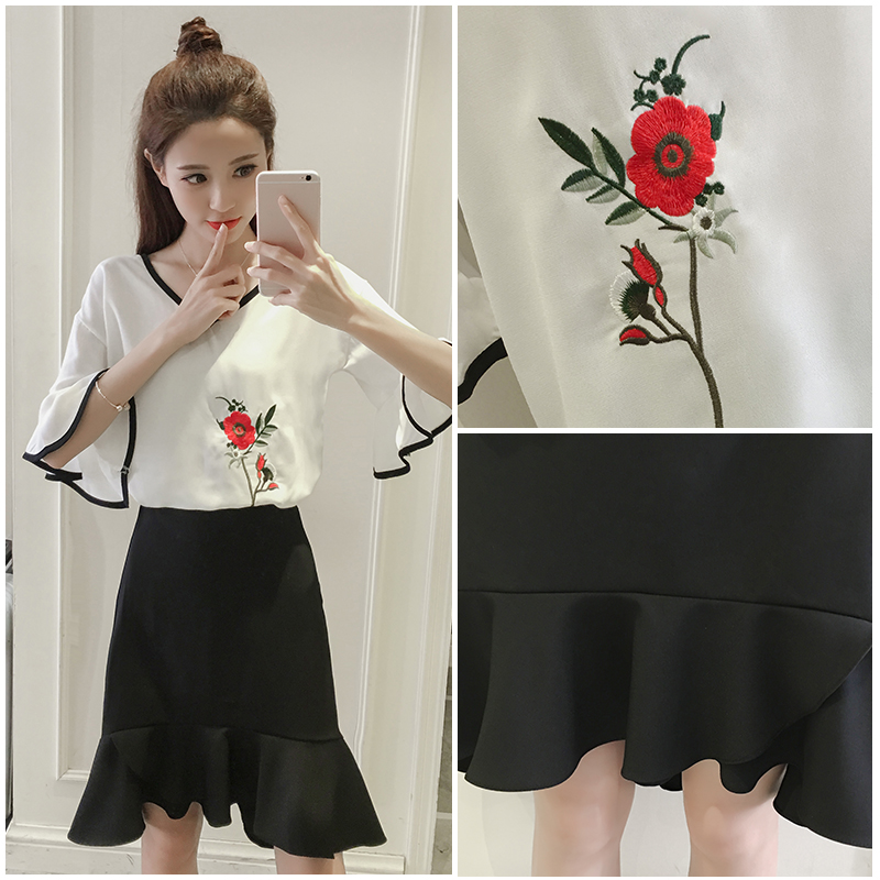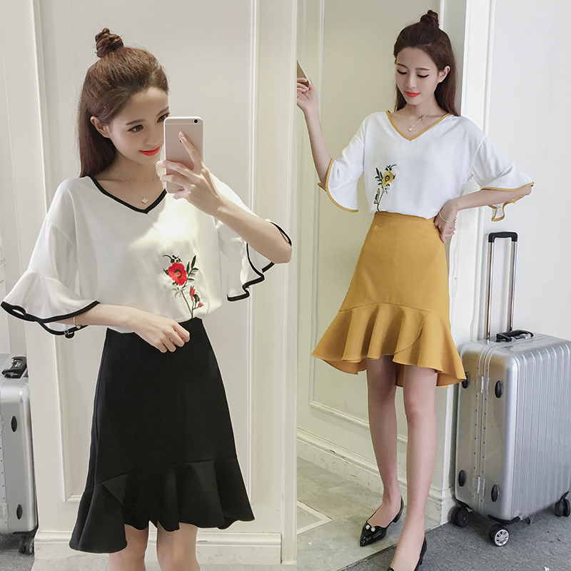 / 夏季新款女裝韓版喇叭袖刺繡上衣休閑半身魚尾裙雪紡兩件套裝