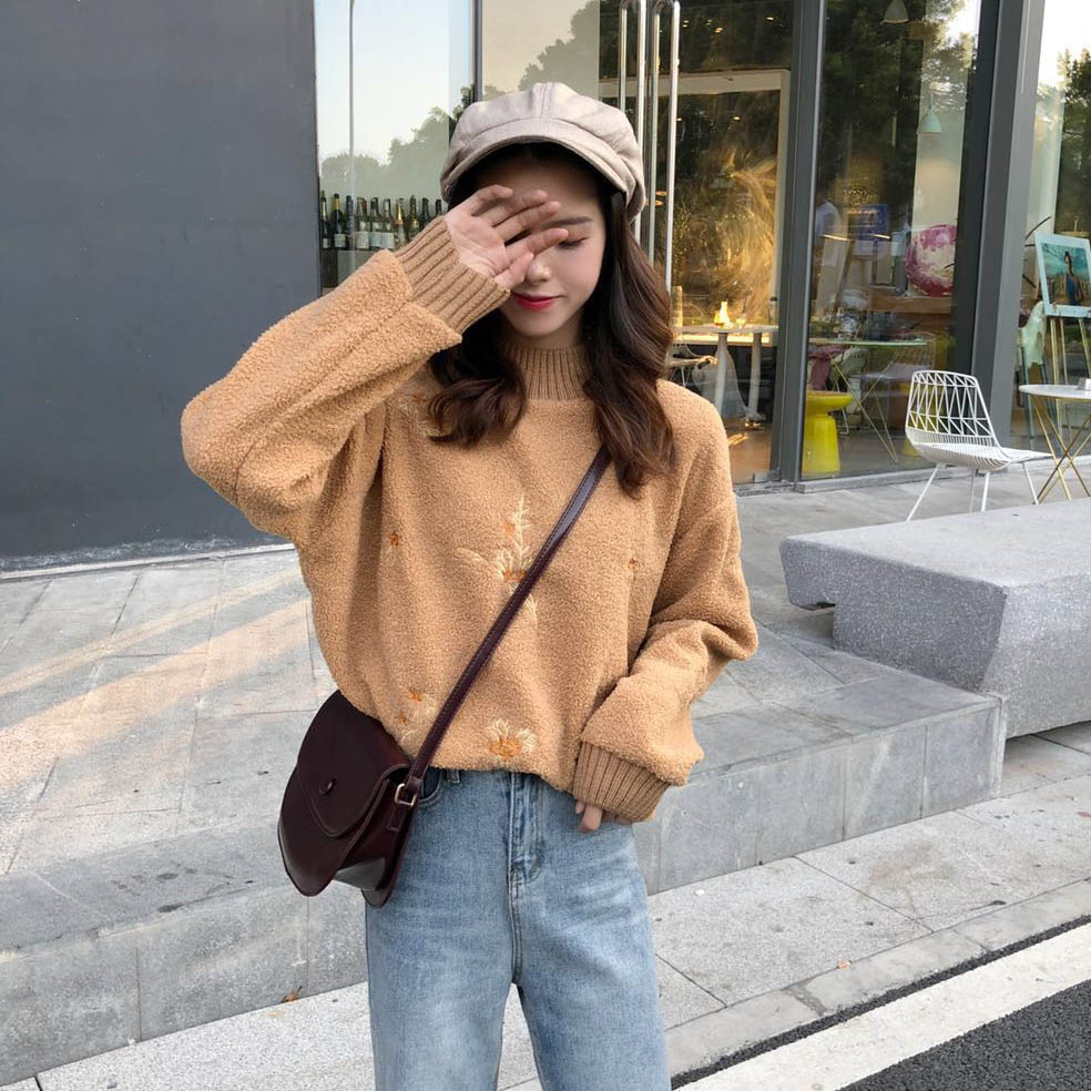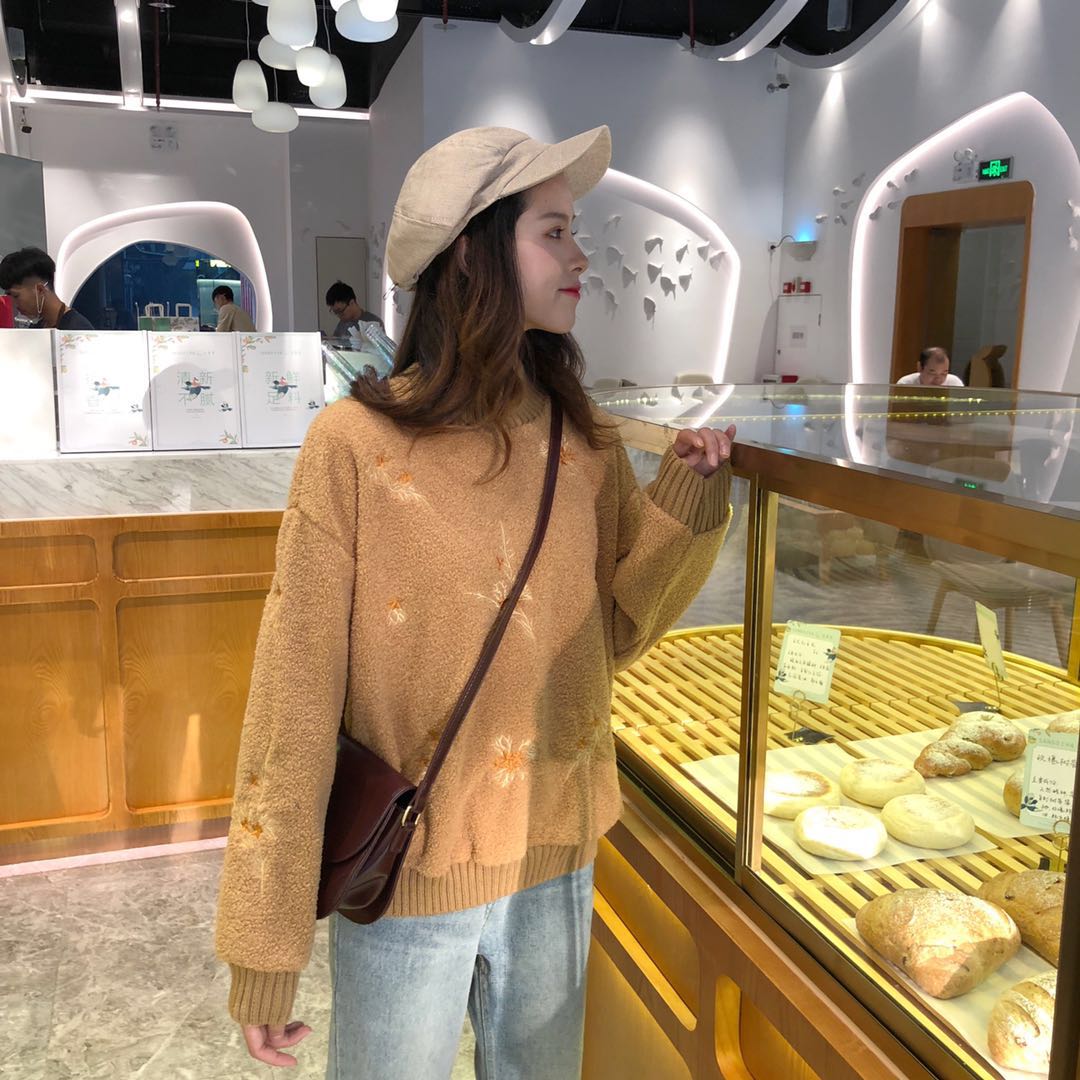 2018新款秋冬女裝韓版寬松花朵繡花仿羊羔毛套頭超火衛衣上衣外套