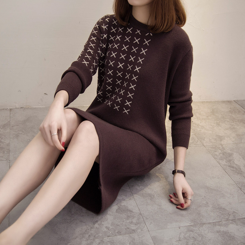 中長款套頭毛衣女秋冬韓版針織衫加厚毛衣裙毛線衣寬松拼色打底衫