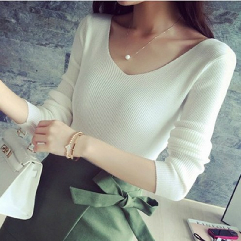 / 套頭毛衣打底衫秋款女裝韓版V領修身短款白色長袖針織衫女上衣潮