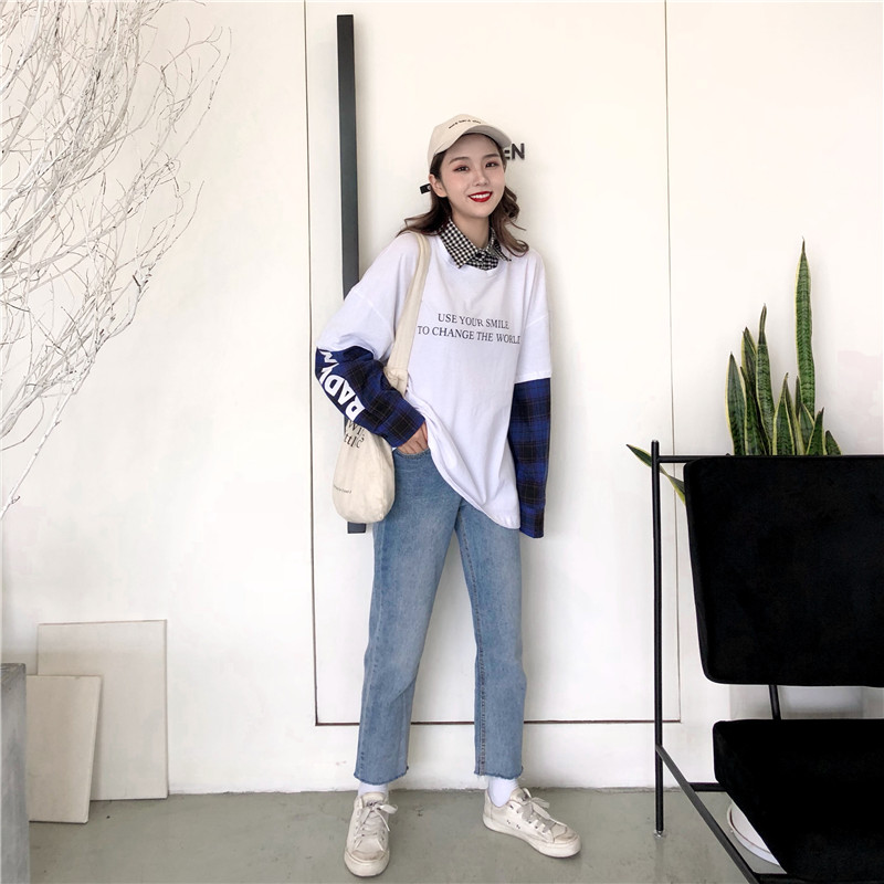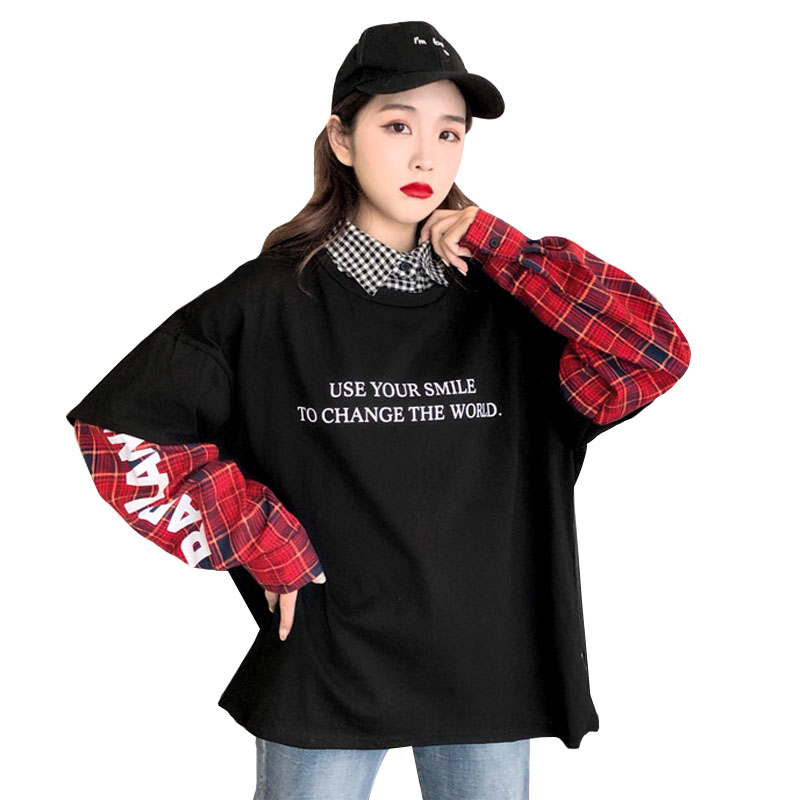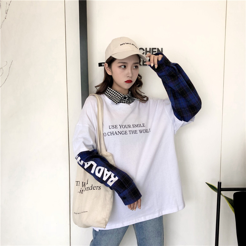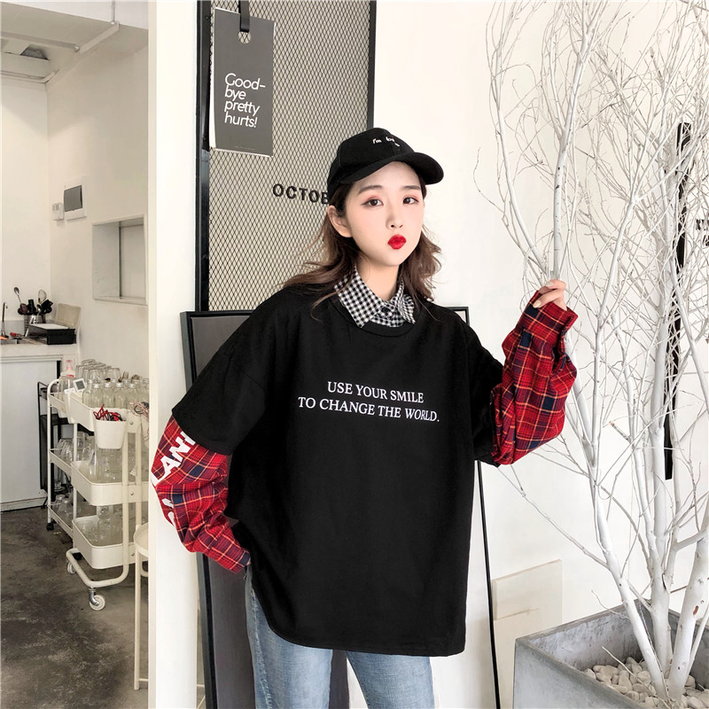 / 秋季女裝韓版BF風寬松格子拼接字母假兩件Polo領長袖T恤顯瘦上衣