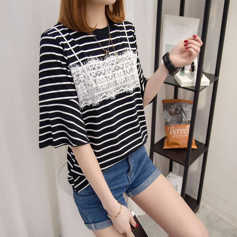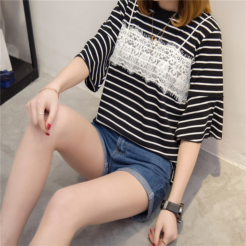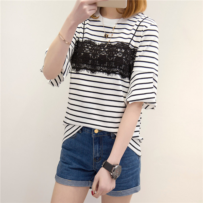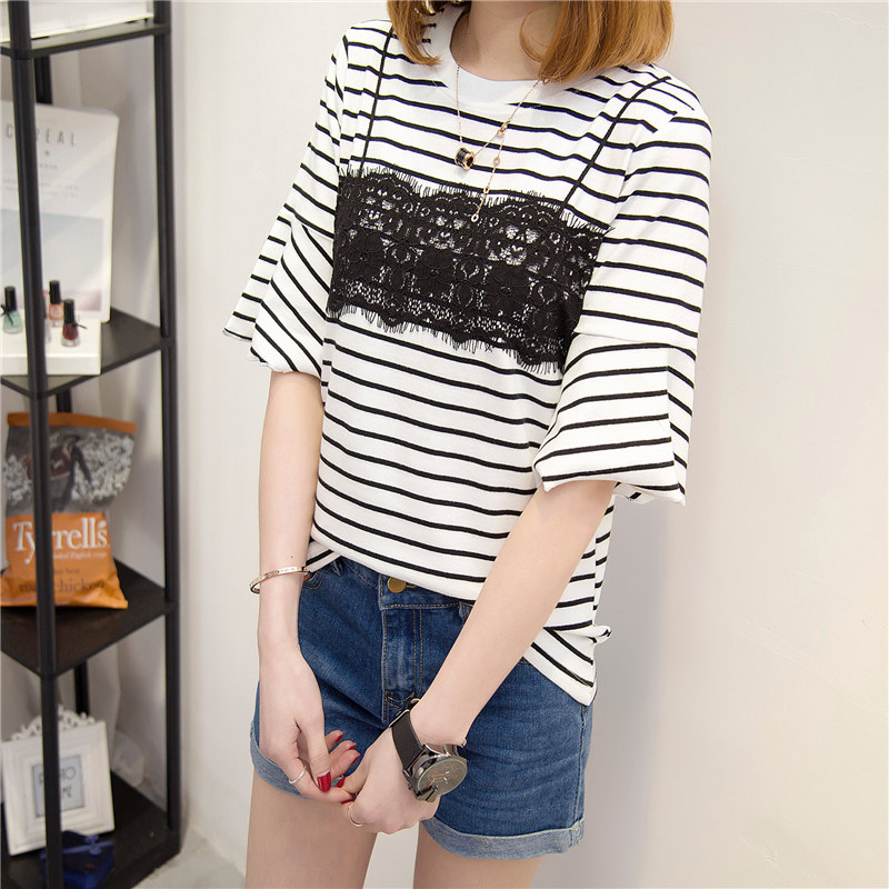 / 春裝新款女蕾絲t恤女寬松韓版條紋短袖體恤女夏季打底衫百搭