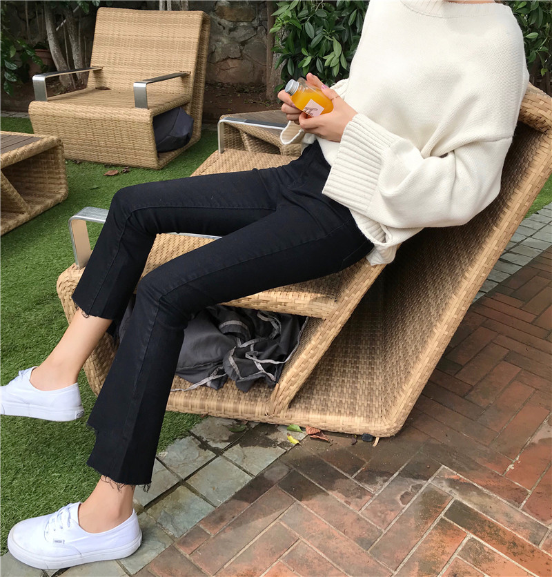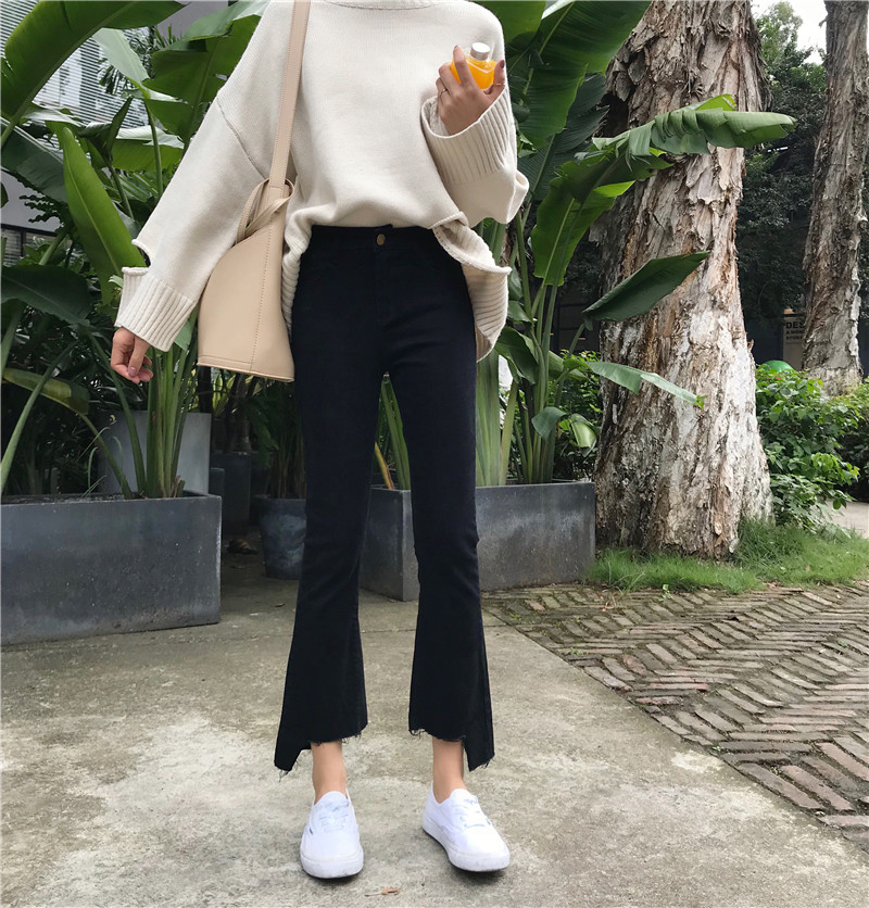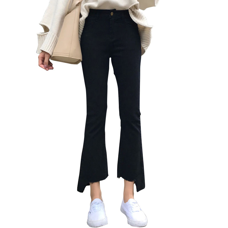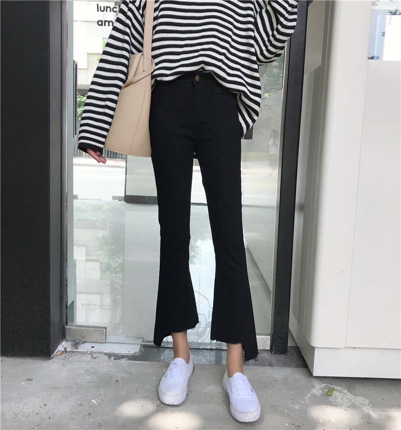 秋裝女裝韓版高腰修身顯瘦不規則毛邊微喇叭褲學生九分褲牛仔褲潮