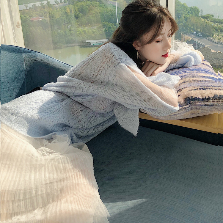 慵懶風拼接網紗系帶長袖圓領針織衫網紅毛衣+仙女氣質網紗蛋糕裙