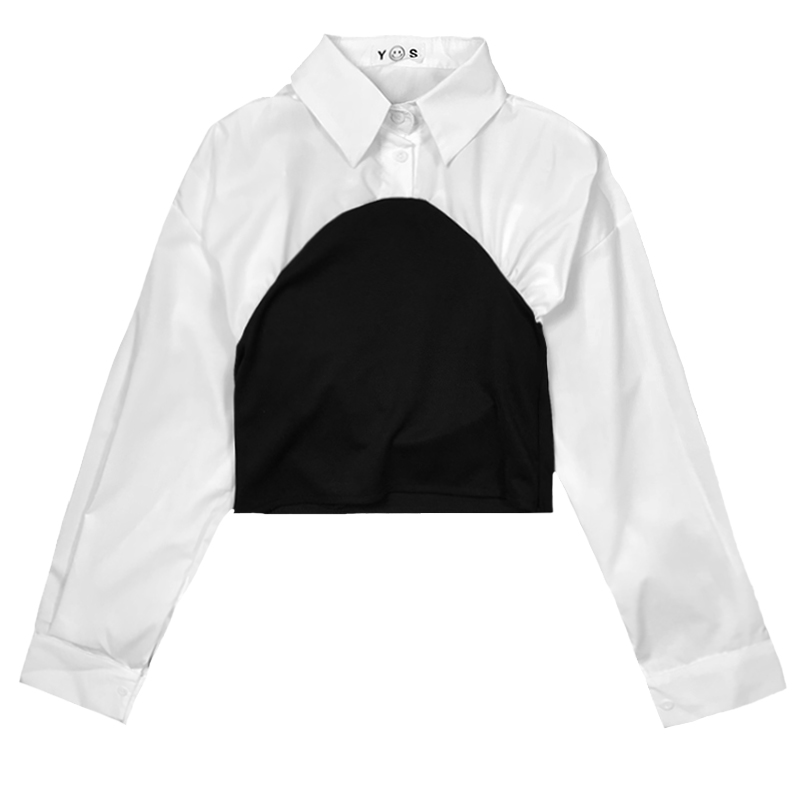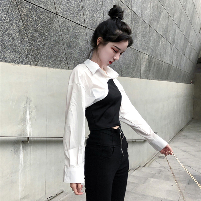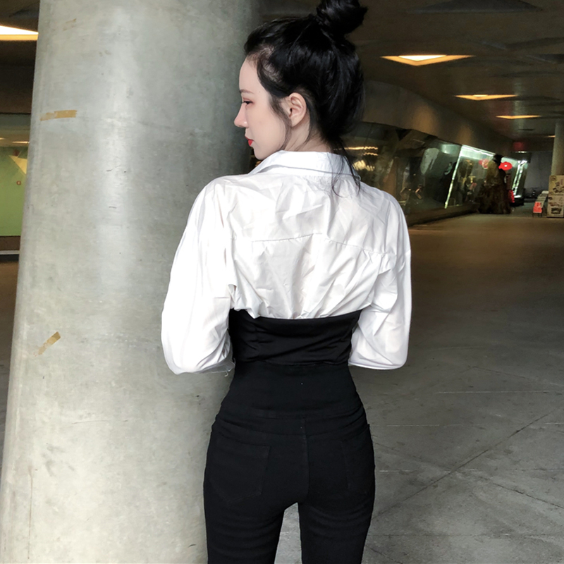 / 2018秋季新款女裝韓版時尚撞色襯衫修身顯瘦長袖上衣翻領短款襯衣