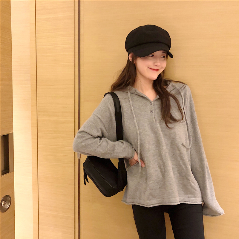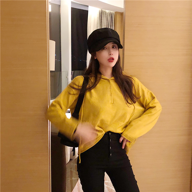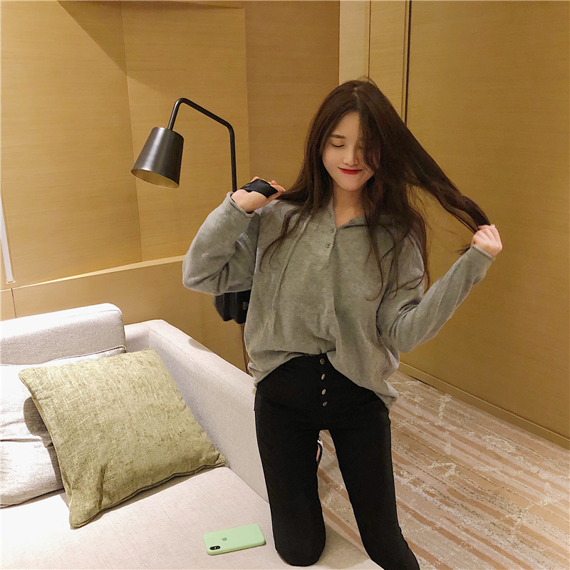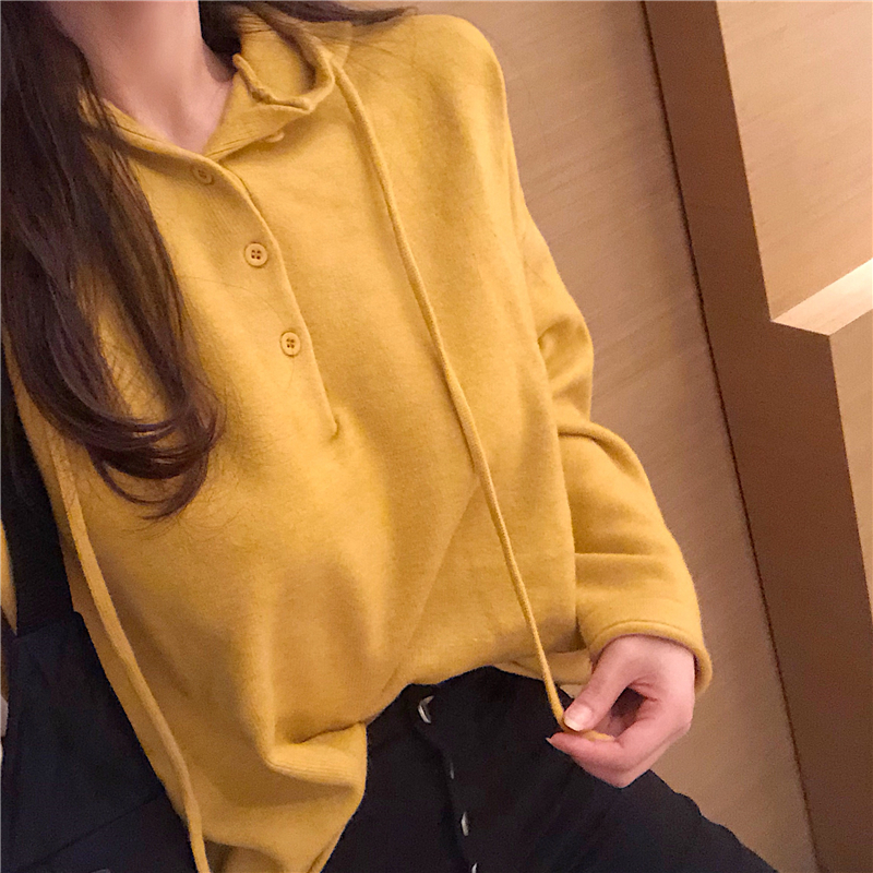 秋冬女裝排扣純色長袖套頭針織衫女2018新款韓版寬松學生連帽毛衣