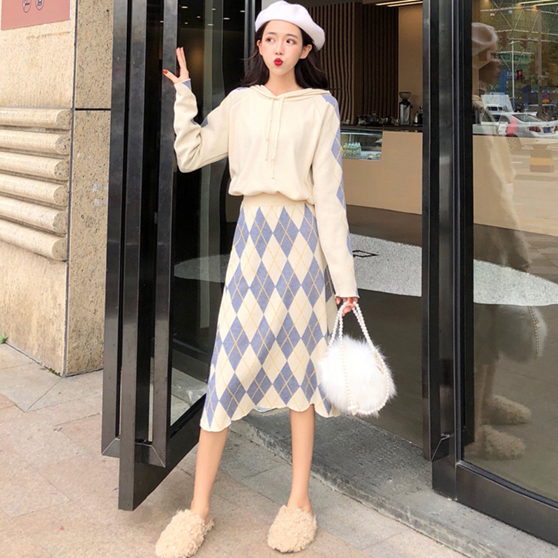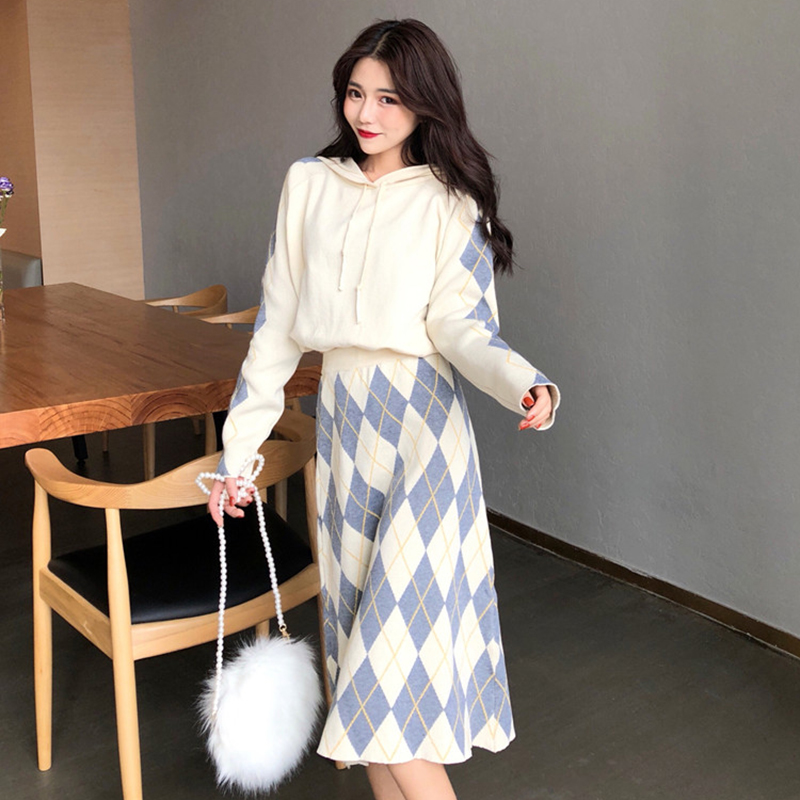 / 網紅洋氣套裝冬裝女新款慵懶套頭毛衣連帽外套復古格子針織半身裙