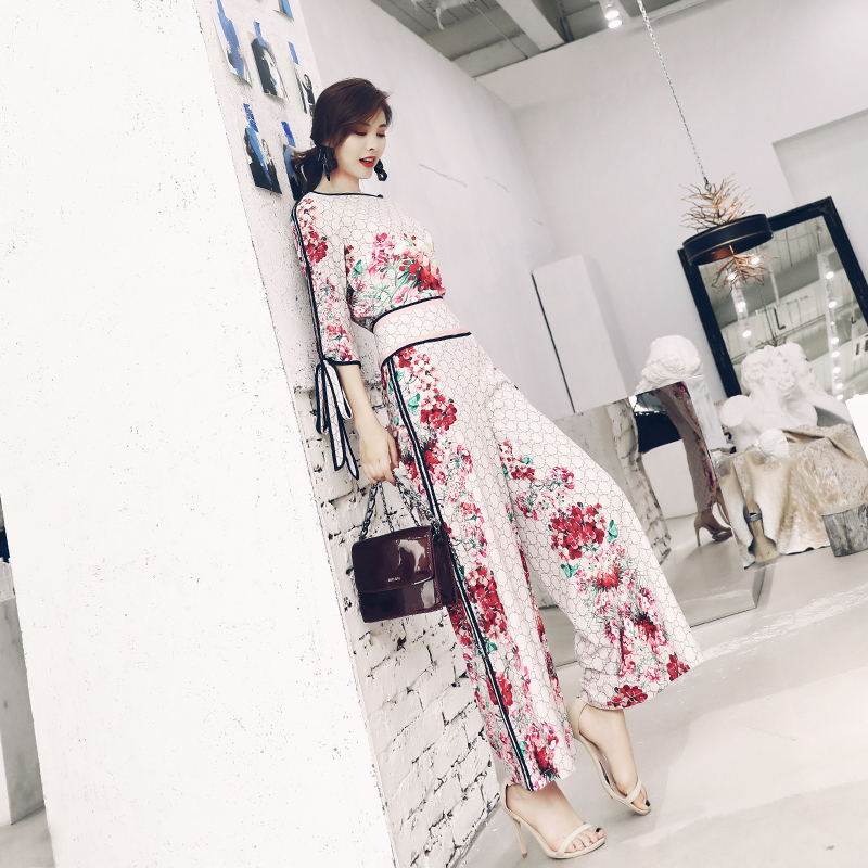/ 名媛氣質復古2018新款女夏顯瘦高腰闊腿褲七分袖上衣洋氣印花套裝
