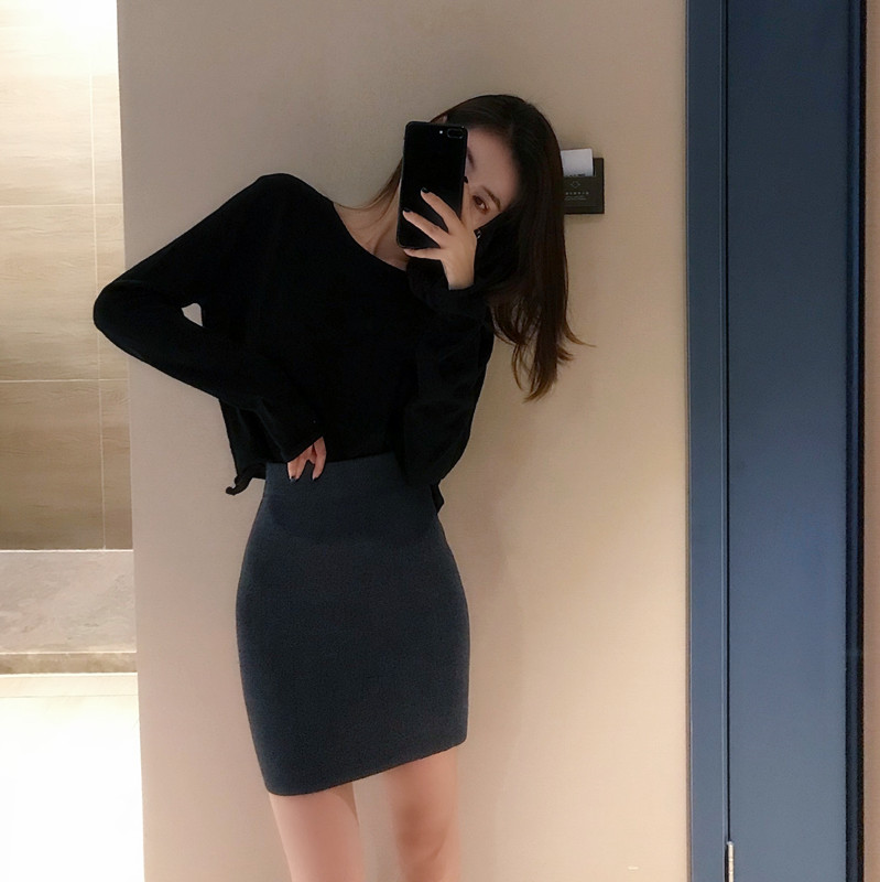 2018新款韓版兩件套女寬松套頭針織衫針織高腰包臀半身裙時尚套裝