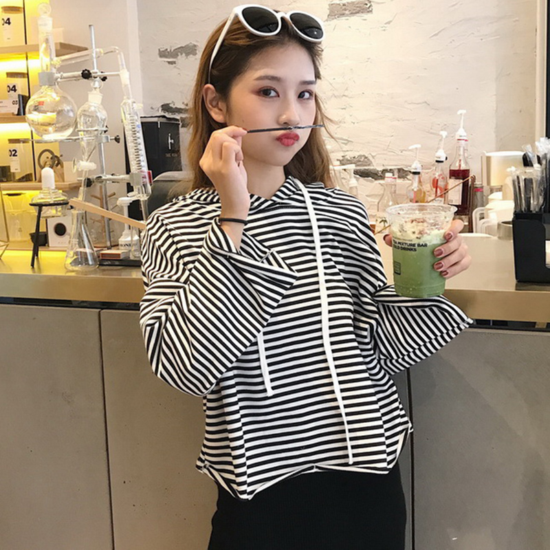 秋裝衛衣女2018新款韓版新款寬松顯瘦慵懶休閑橫條紋連帽長袖上衣