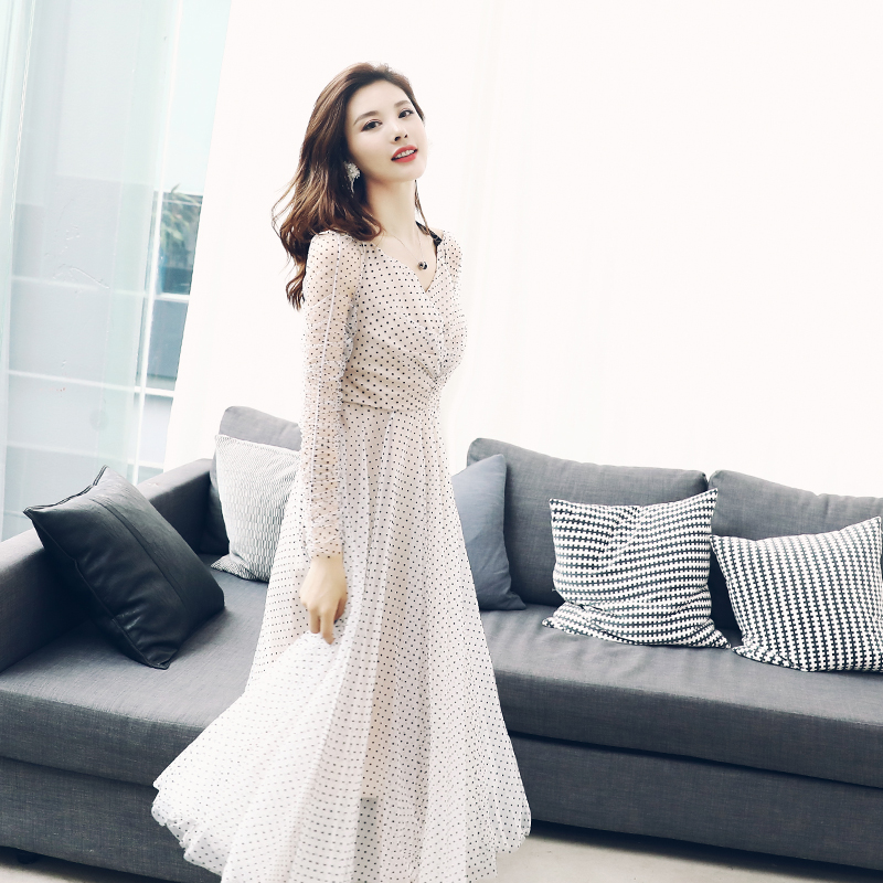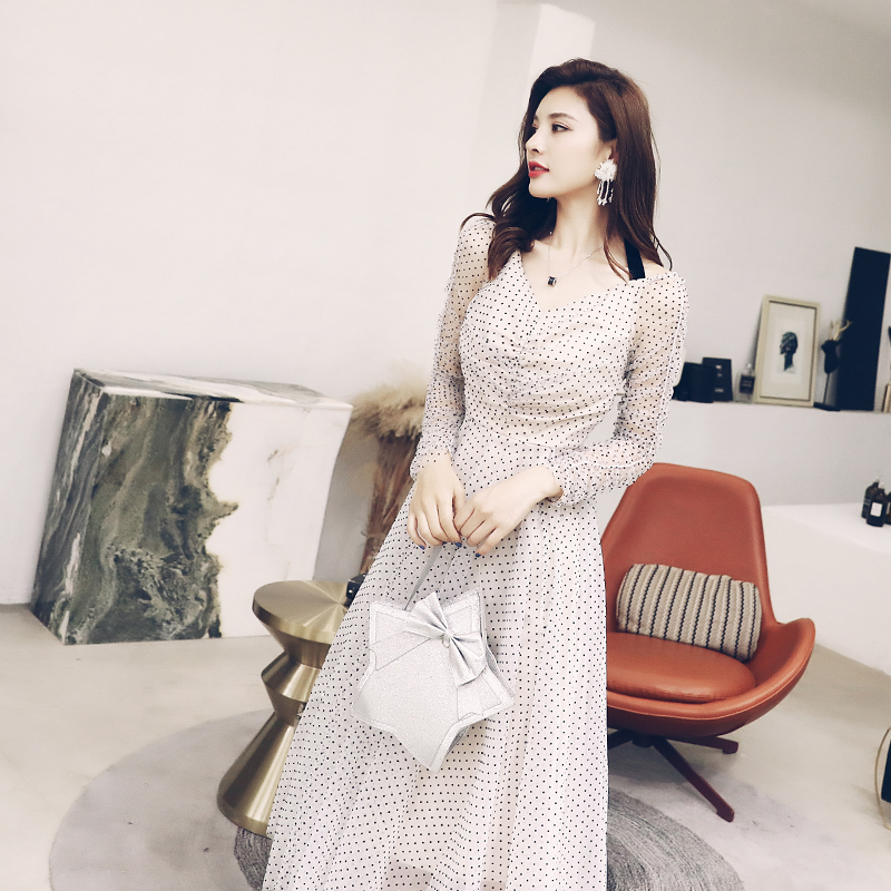 淑女波點性感連衣裙女夏冷淡風2018新款收腰長袖小清新收腰裙子